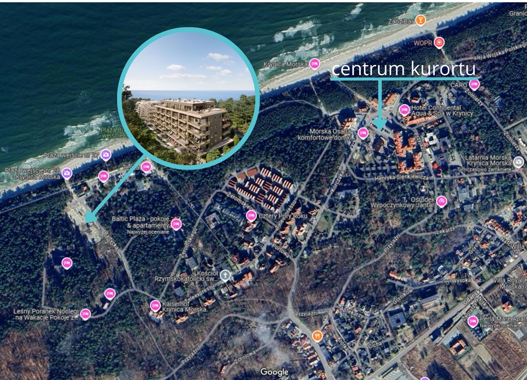 Inwestycja położona jest w zachodniej części Krynicy Morskiej, w otoczeniu sosnowych lasów i co najważniejsze na lekkim wzniesieniu – dzięki czemu z wielu apartamentów podziwiać będzie można błękit Bałtyku. Budynki będą mieć 5 pięter, w sumie w całym kompleksie powstaną 82 apartamenty.