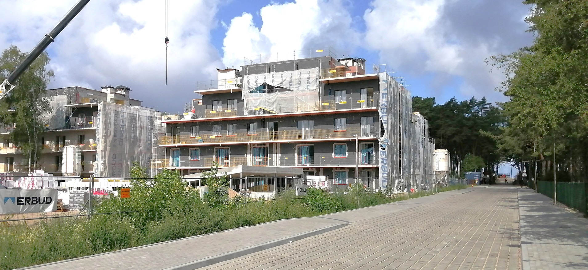 Inwestycja powstaje w doskonałej lokalizacji, dosłownie tuż przy plaży, wzdłuż jednego z głownych dojść do morza w Dąbkach, fot. InwestycjewKurortach.pl, stan budowy wakacje 2023 r.
