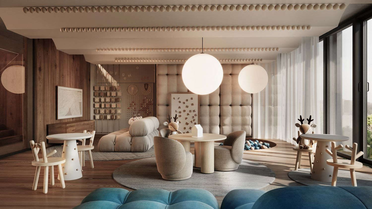 Zaplanowano także zewnętrzną strefę wellness z basenem, narciarnię i salę zabaw dla dzieci. W budynku na dole znajdzie się też lobby z recepcją