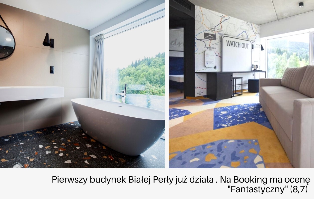Zakończeniem całego procesu inwestycyjnego jest ostatni budynek – Biała Perła II. Jak opisuje go deweloper – hotel na stoku. I nie ma w tym przesady, ponieważ inwestycja powstaje naprawdę praktycznie na stoku, tuż przy dolnej stacji całorocznej kolei na Czarną Górę. Jest dopełnieniem działającej już od jesieni 2021 r. pierwszej części hotelowej – stojącego obok budynku Biała Perła.