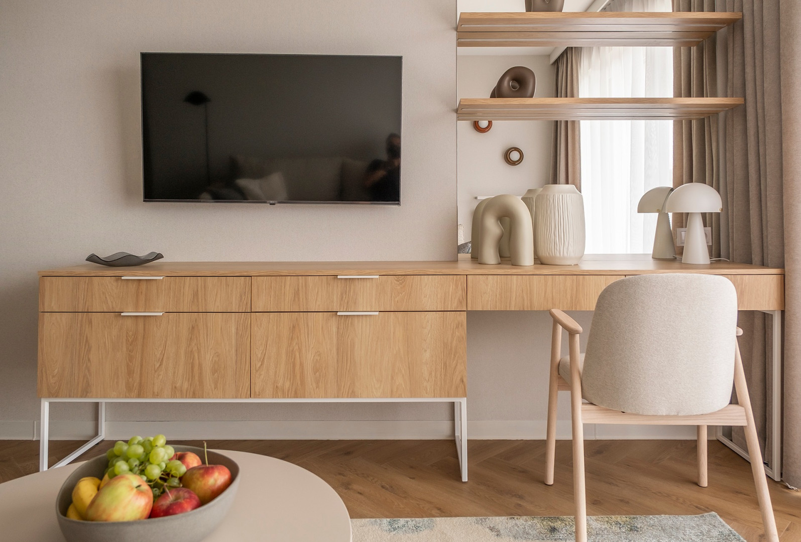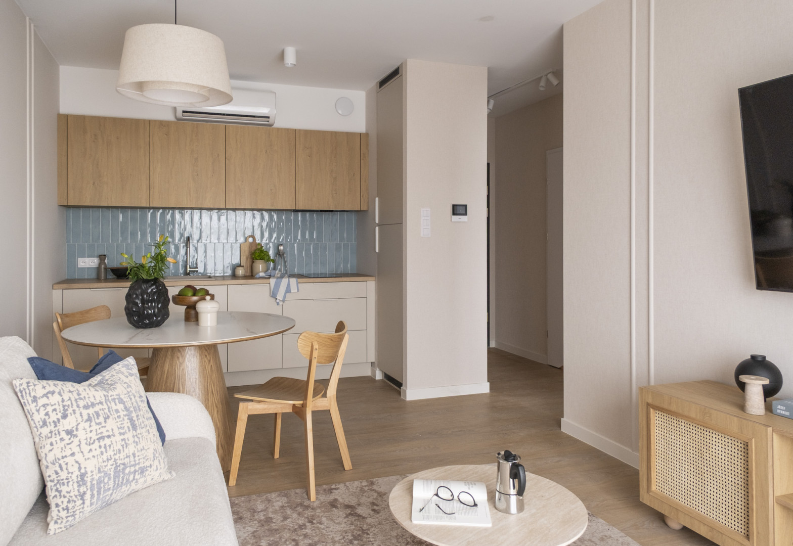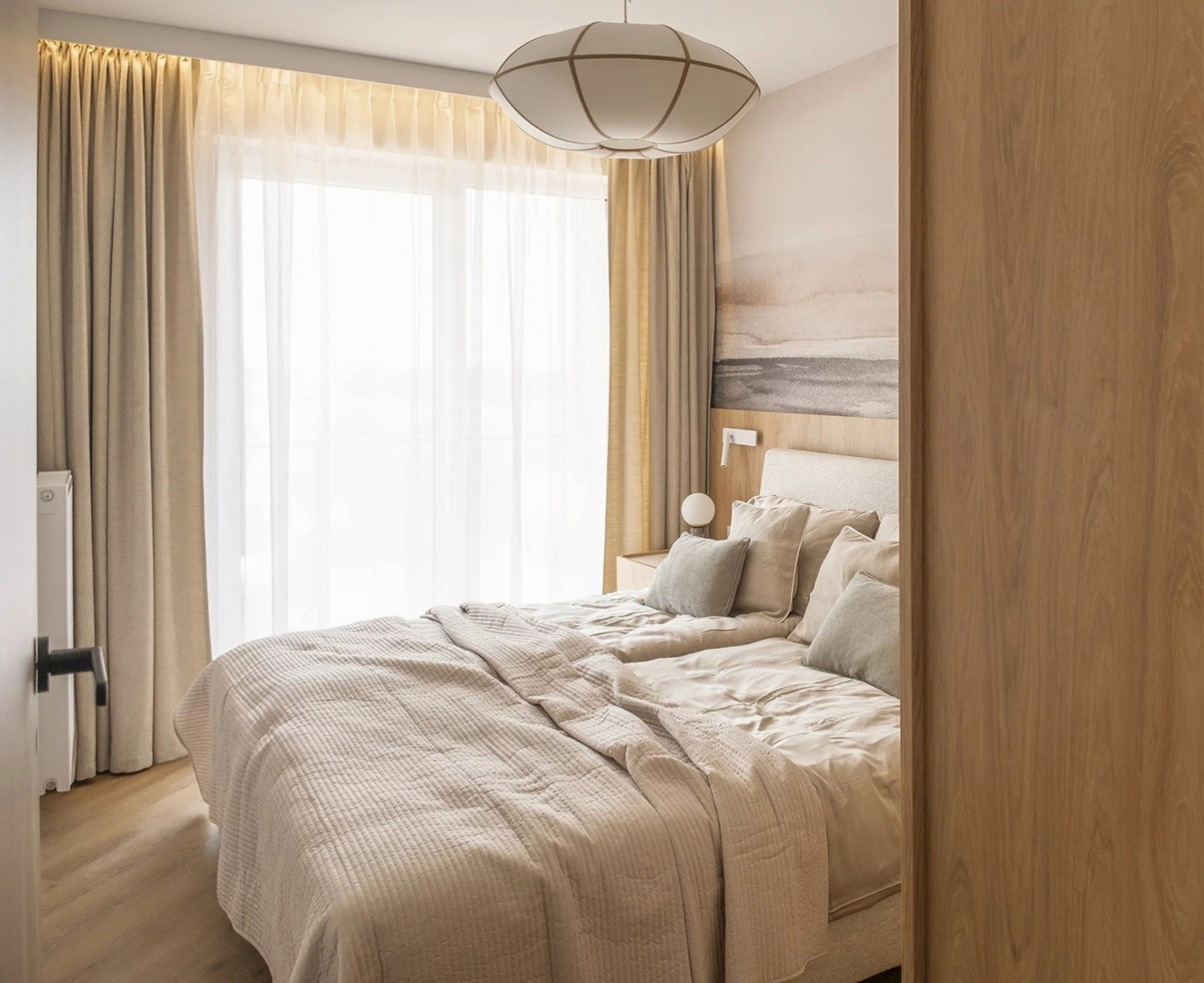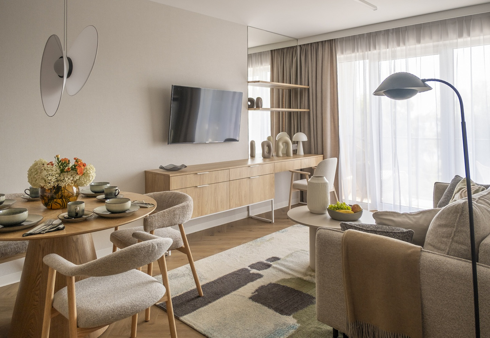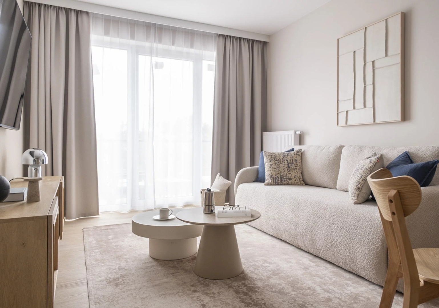 Wnętrza apartamentów wykończone są w podobnie spokojnym charakterze. W dwóch budynkach deweloper wykończył część lokali, dla tych którzy wolą lokal od razu gotowy do wynajmu lub wypoczynku. Jest w nich wszystko włącznie z meblami, sprzętem AGD i TV oraz zastawą stołową i tekstyliami. Kupujący mogą zdecydować się na dwa rodzaje pakietów wyposażenia – za 119 tys. zł brutto lub 139 tys. zł. To jak wyjaśnia deweloper opcja bez czekania, bez ryzyka, bez ukrytych kosztów, czyli najbardziej przejrzysty model dostępny dziś na rynku. Kupujący dokładnie wie co i za ile nabywa na własność.