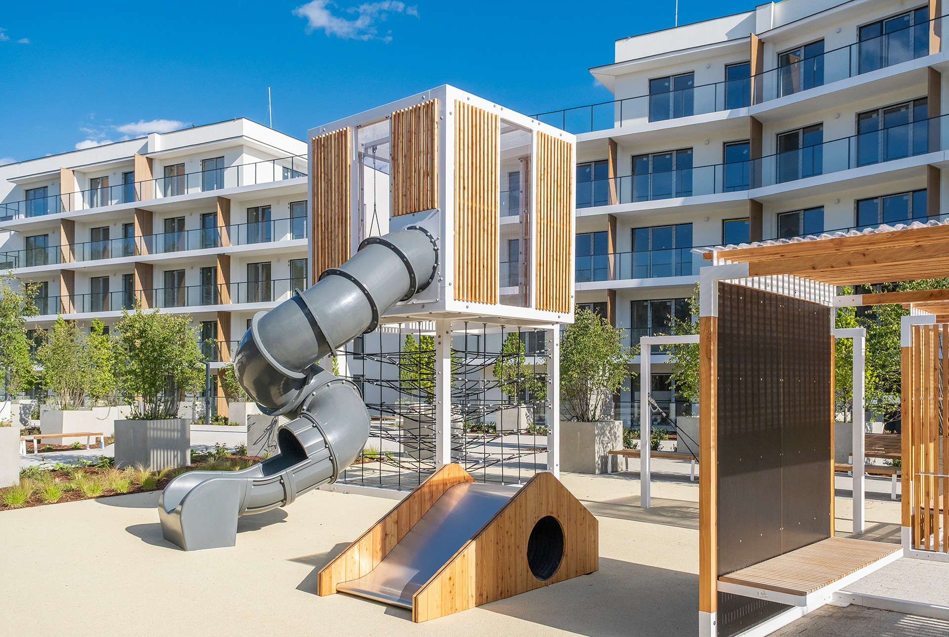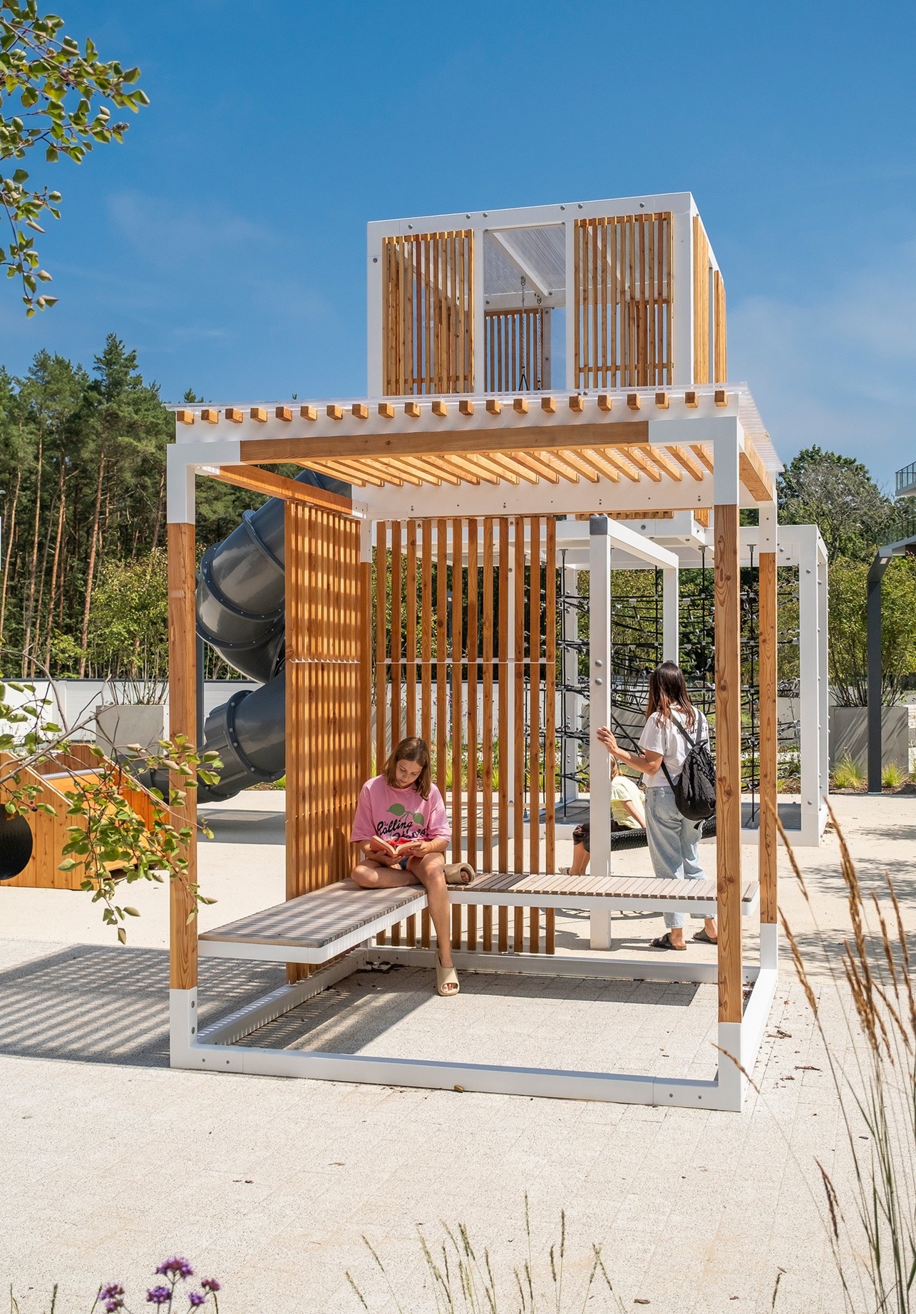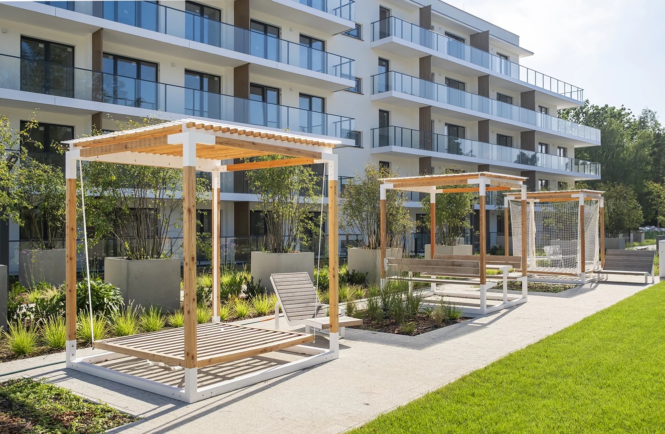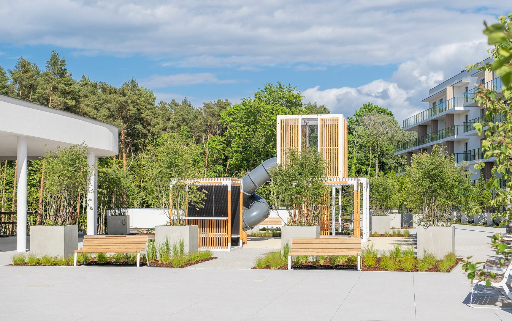 Kolorystyka przestrzeni wspólnych współgra z kurortową lokalizacją, zadbano o wiele miejsc do wypoczynku w otoczeniu zieleni, małą architekturę zbudowano głównie z wykorzystaniem naturalnego drewna, nawet plac zabaw dla dzieci kolorystycznie wpisuje się w wakacyjny trend nadbałtyckiej miejscowości