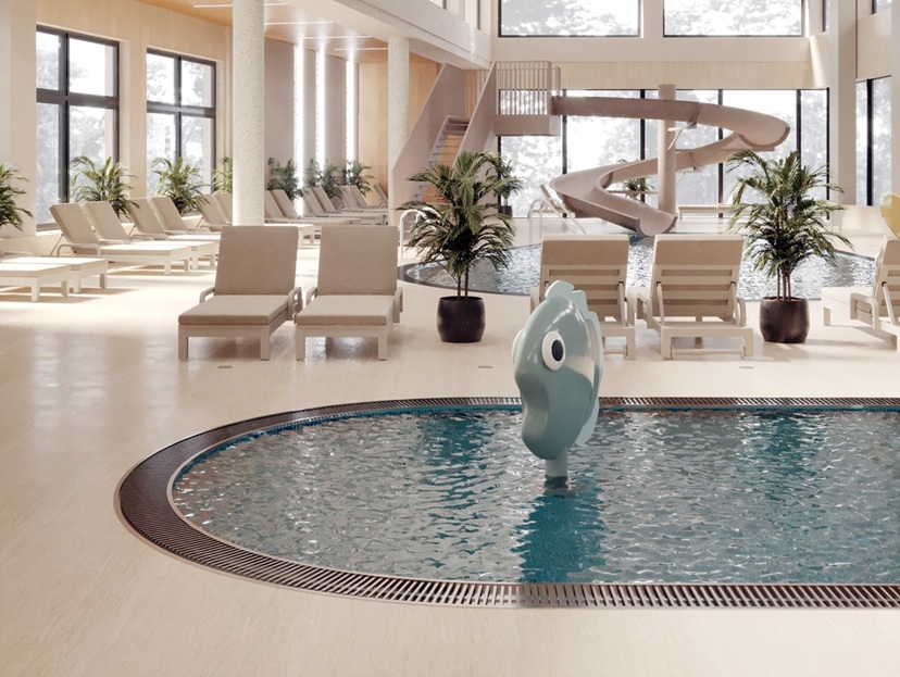 Zaplanowano m.in. 3 baseny wewnętrzne wraz ze zjeżdżalnią wodną, saunarium z 4 saunami, gabinety beauty, grotę solną, salę fitness oraz kort do squasha i strefy do zabaw dla dzieci w budynkach. Dodatkowo także wypożyczalnia sprzętu sportowego (rowery, kajaki, SUP-y, sprzęt do kitesurfingu), kilka sal konferencyjnych, a także sklep Żabka.