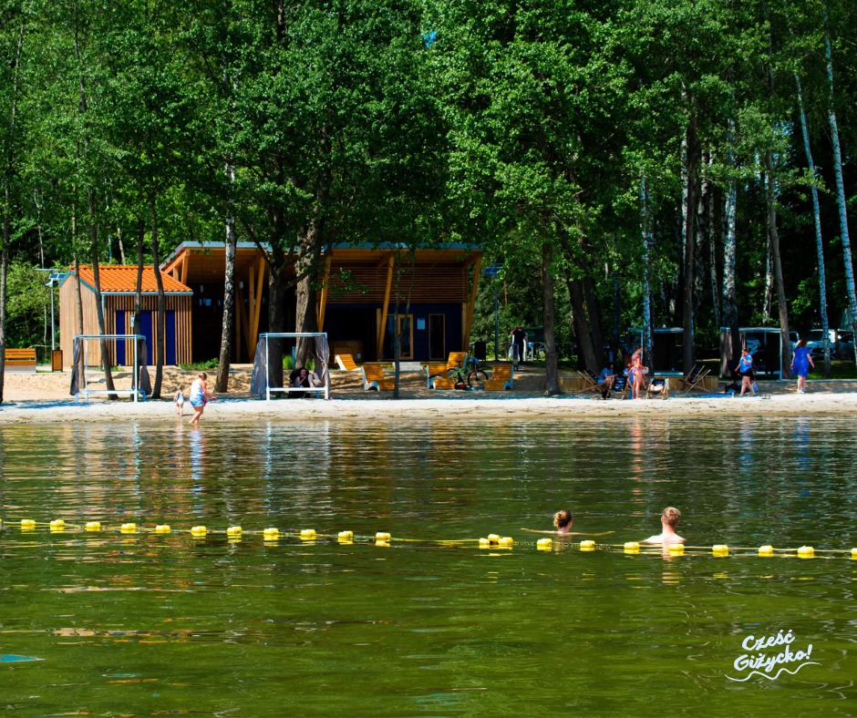 Wypoczynek na ogólnodostępnej plaży nad Niegocinem od strony kanału na jez. Kisjano jest teraz bardziej komfortowy, fot. górne Cześć Giżycko, dolne Nautica Resort