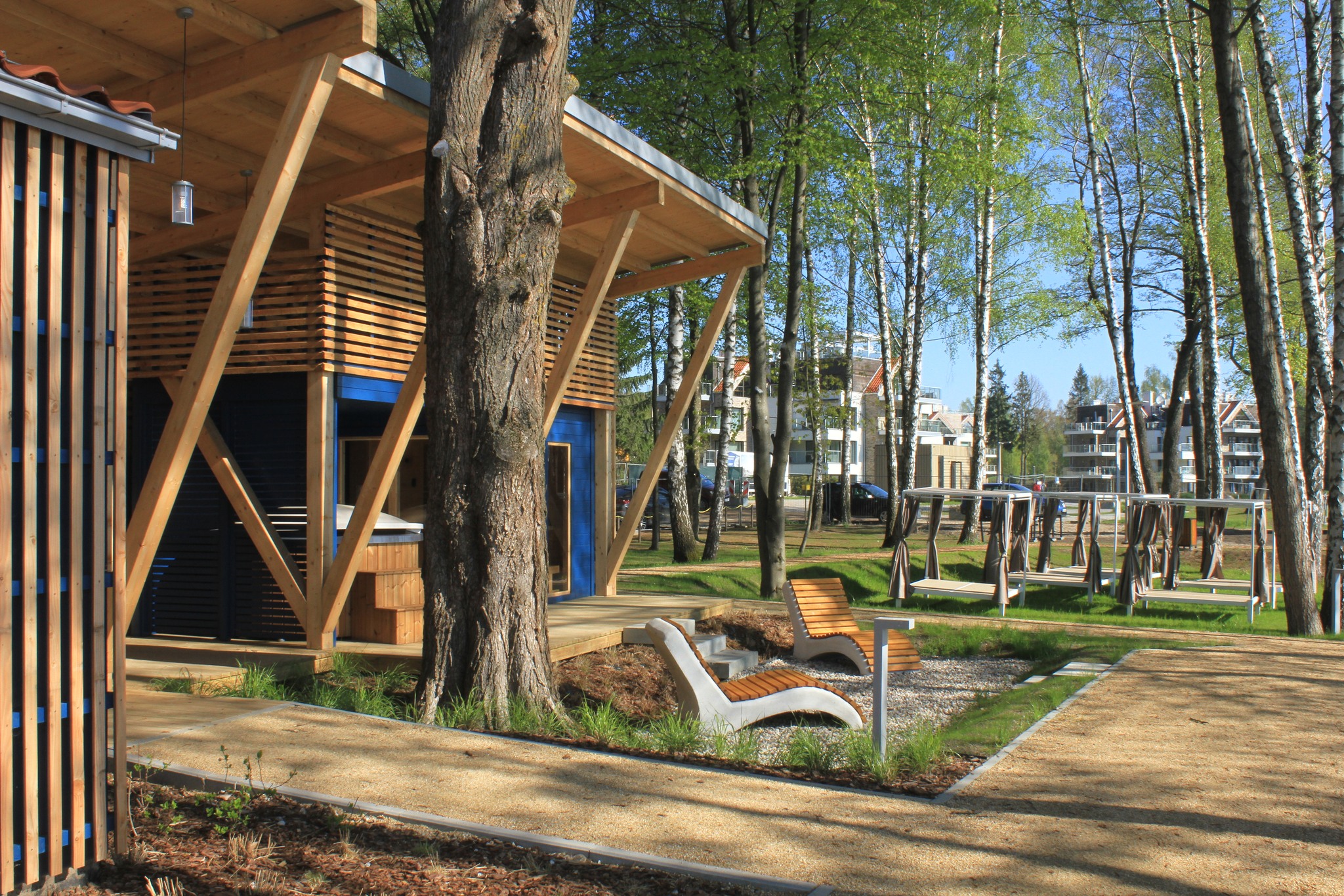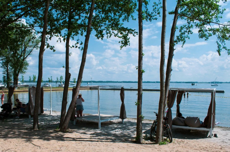 Projektanci planując przestrzeń i małą architekturę kierowali się uwzględniając różne potrzeby użytkowników zarówno tych najmłodszych jak i trochę starszych. I to widać. Są strefy do leżenia, siedzenia, zabawy i otwarte miejsca, w których rozłożyć można leżaki czy koc nad wodą. W budynku sanitarnym znajdują się sauna, wypożyczalnia sprzętu wodnego, toalety oraz jest też miejsce do mycia naczyń dla zawijających do portu żeglarzy.