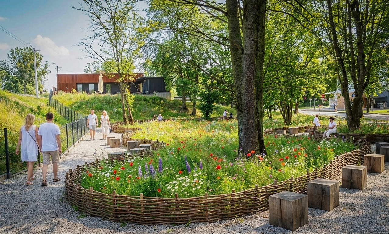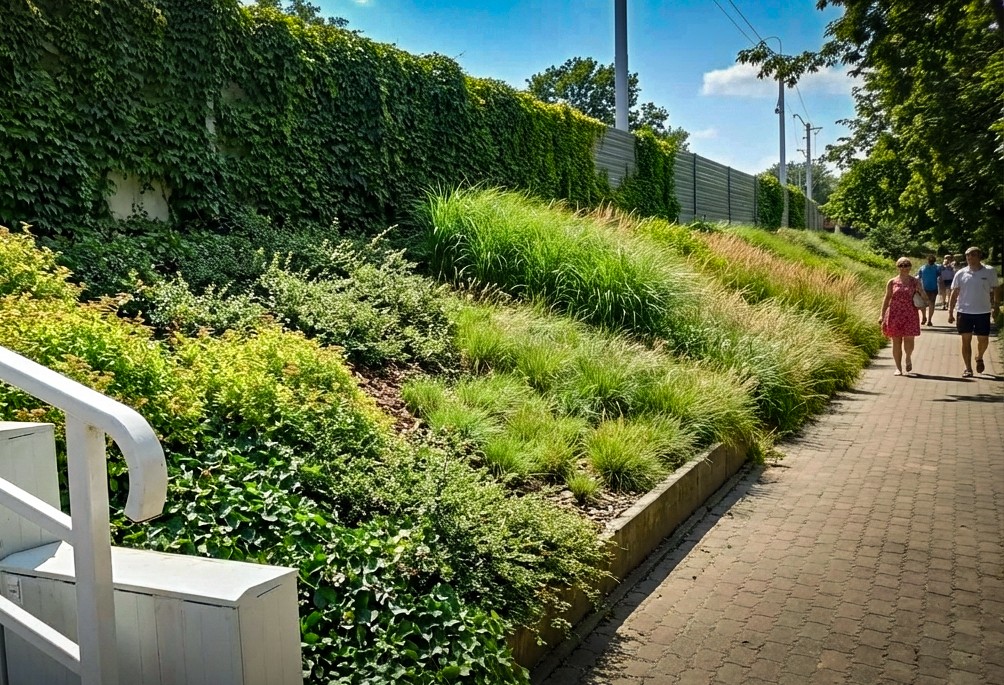 Dalej, w kierunku miasta i drogi, pojawi się kolejny pas zieleni – z trawami ozdobnymi i mieszanką gatunków rodzimych oraz odpornych na warunki miejskie. Miejscami zaplanowano również wąskie fragmenty trawnika, koszonego jedynie punktowo, dla zachowania estetyki i czytelności przestrzeni.