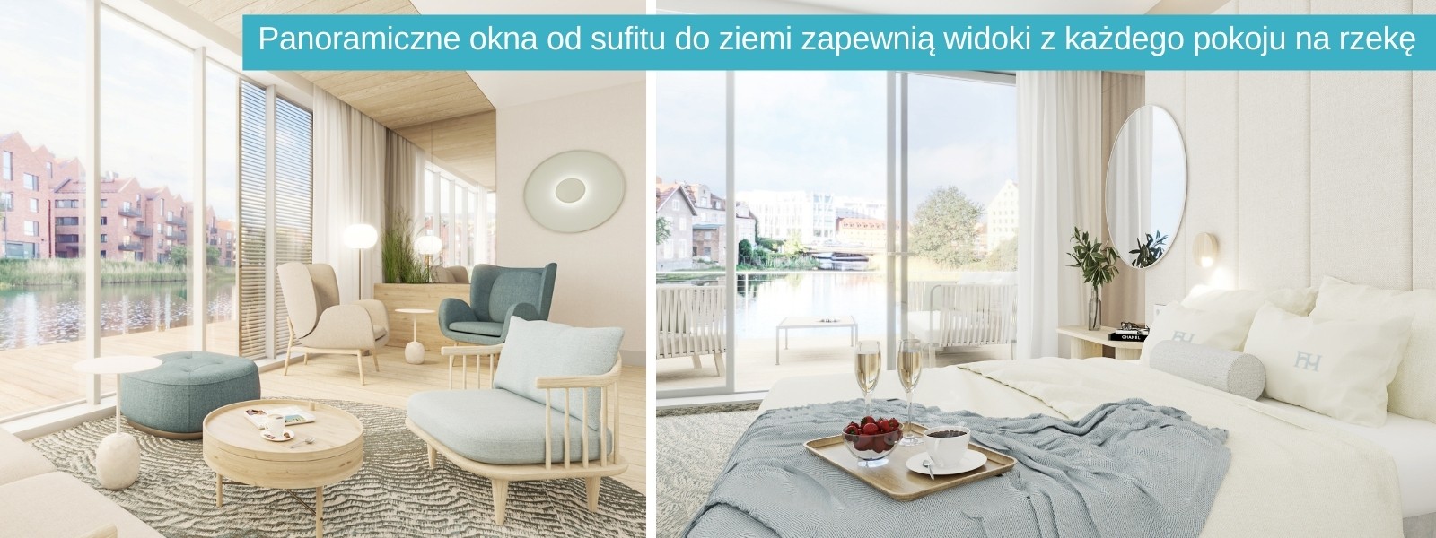 Hotel zapewni widok na rzekę oraz historyczne i nowoczesne zabudowania gdańskiego Głównego Miasta. Chłodne wieczory goście będą mogli spędzać w saunie. Dodatkowym atutem będzie restauracja z tarasem, do którego będzie można podpłynąć i przycumować kajak lub motorówkę. Projekt architektoniczny inwestycji opracowało biuro Art Architekci z Gdańska.