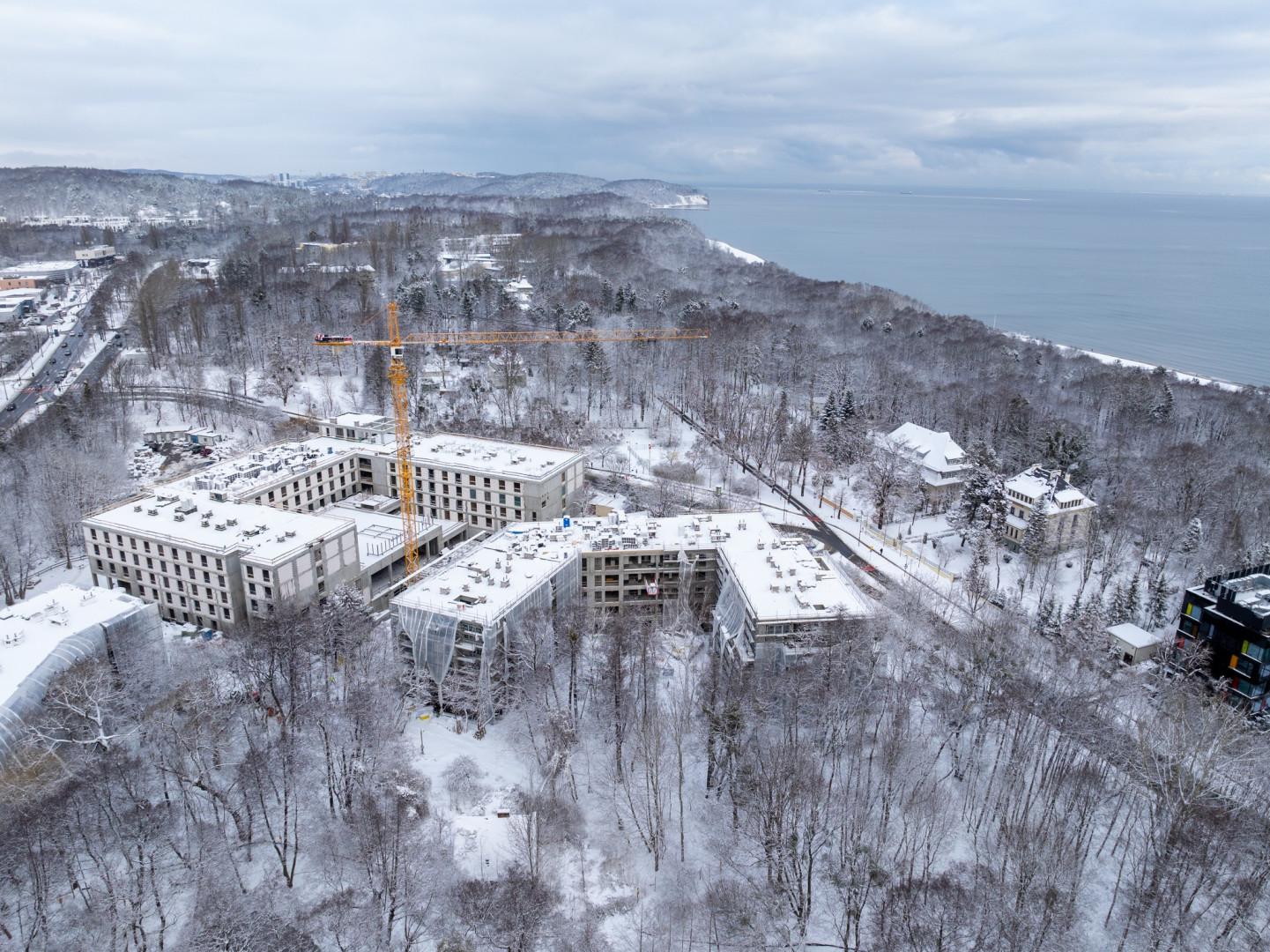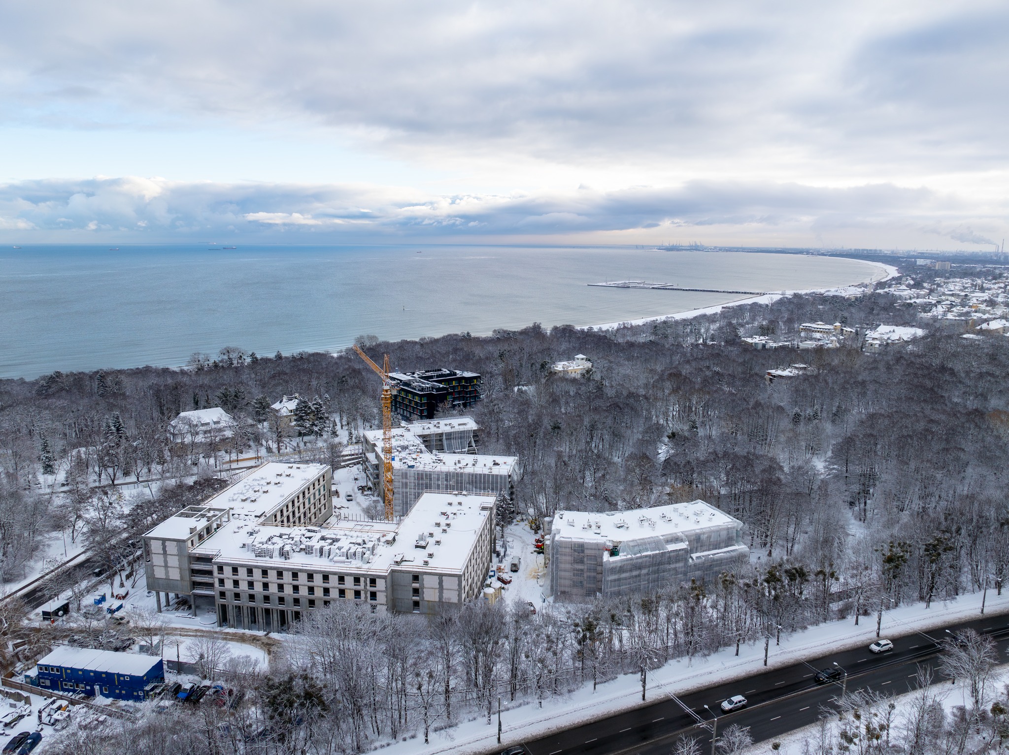 Hotel jest największym z 3 budynków w całym kompleksie powstającym przy ul. Haffnera w Sopocie, top lokalizacja przy plaży i parku uzdrowiska, fot. Cordia Polska, stan budowy styczeń 2026 r.