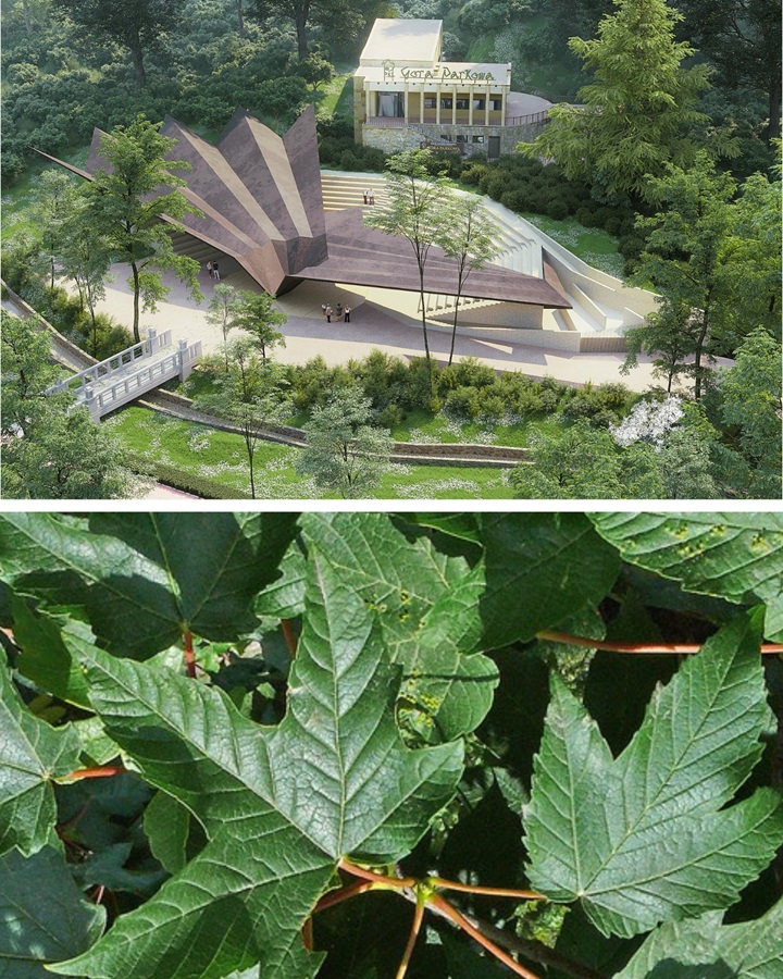 Inspiracją do projektu dachu była dla architektów natura - liście jaworu, fot. wizualizacja i zdjęcie z budowy Saneccy