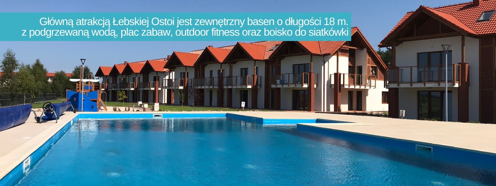 - Główną atrakcją Łebskiej Ostoi jest zewnętrzny basen o długości 18 m., z podgrzewaną wodą, oraz duży brodzik o średnicy 7 m.