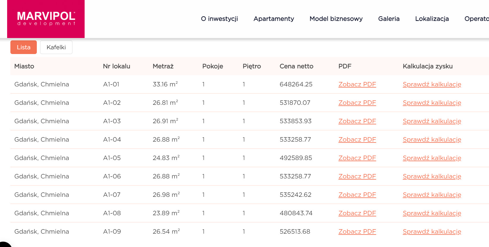 Na swojej stronie www Marvipol przedstawia zarówno ceny wszystkich lokali, jak i prognozowane zyski dla inwestrów indywidualnych, fot. screen marvipol.pl