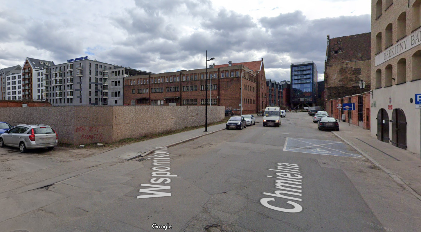 Inwestycja powstać ma dokładnie na działce ogrodzonej parkanem, to południowa część Wyspy Spichrzów, oddzielona kilkupasmową ulicą od głównej, turystycznej strefy z restauracjami, ale dzięki przejściu podziemnemu turyści mogą w kilka minut znaleźć się na ul. Długi Targ, w centrum gdańskiego starego miasta, fot. Google Maps