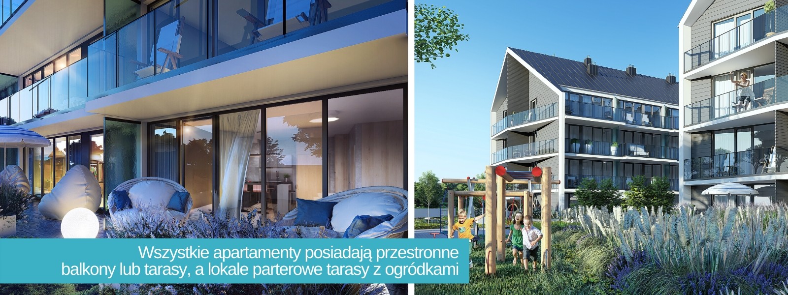 - Wszystkie apartamenty posiadają przestronne balkony lub tarasy, a lokale parterowe tarasy z ogródkami