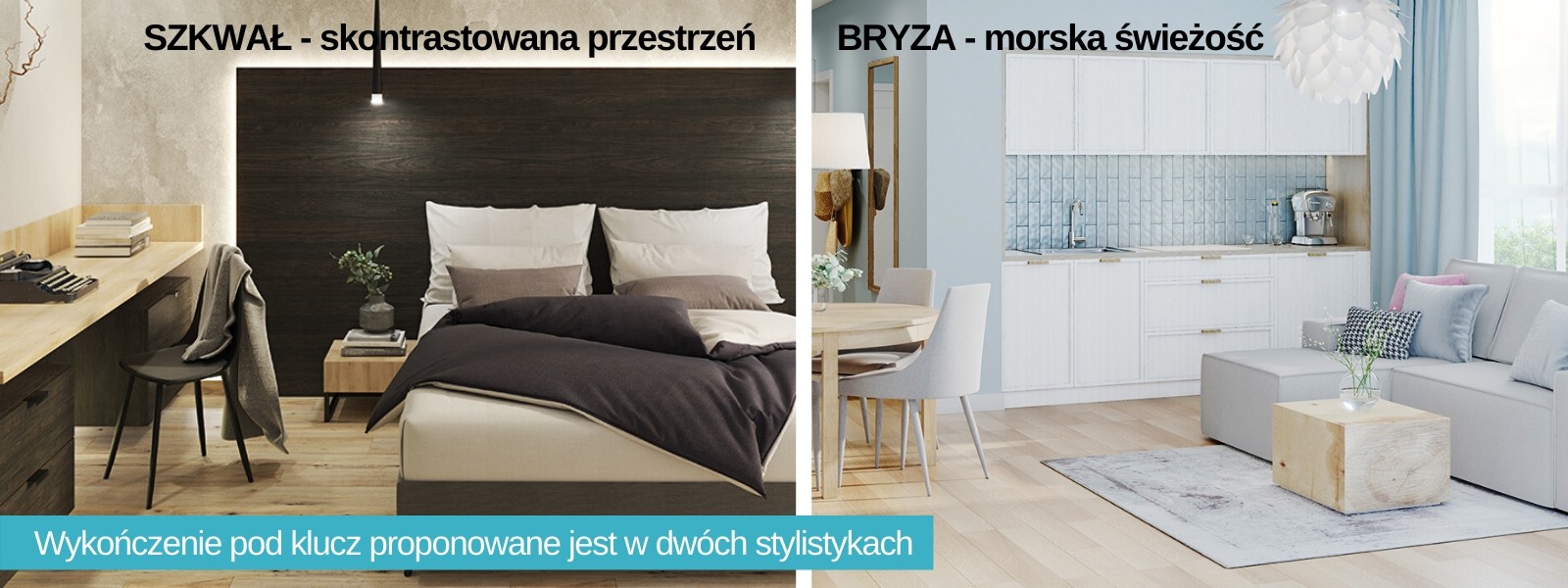 - Szkwał – jak to szkwał musi być z charakterem, i taki jest też standard wykończenia apartamentu w tym pakiecie. To skontrastowana przestrzeń, dla tych którzy stawiają na mocne akcenty, bez zbędnych dodatków. W tych wnętrzach dominować ma imitacja betonu, naturalne drewno, czerń i biel, z lekką nutą turkusu.