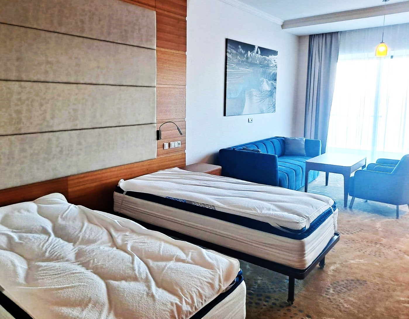 Aranżacja pokoi hotelowych utrzymana jest raczej w klasycznej stylistyce hoteli typu Hilton czy Marriott. Drewno w kolorystyce dębu na ścianach, biurkach oraz jako zabudowa TV. Łazienki w klasycznej bieli i szarości marmurów. Do tego granatowe, eleganckie meble i wykładziny hotelowe o stonowanej kolorystyce i wzornictwie.