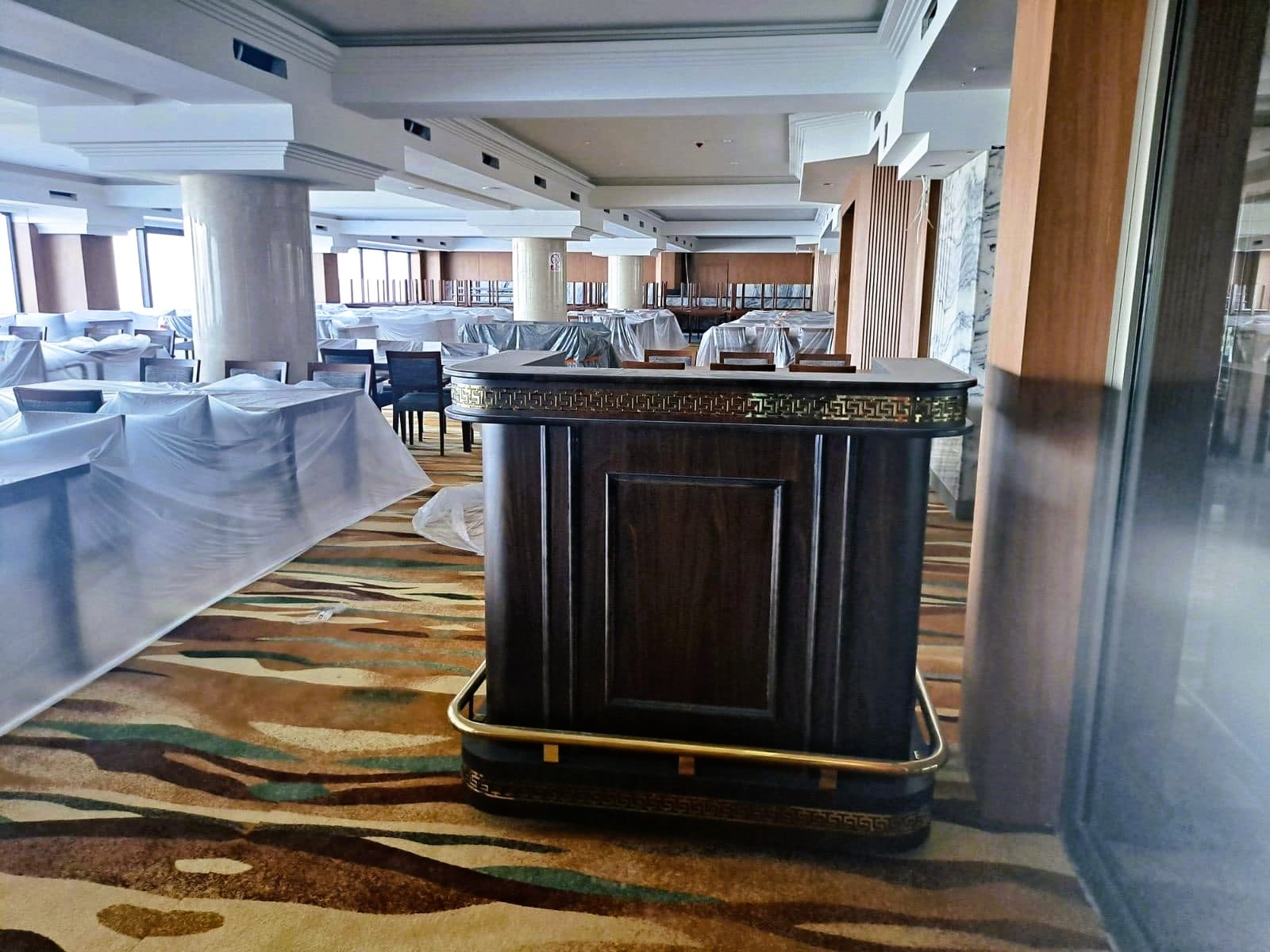 Również w strefach gastronomicznych, w których ustawiono już ciemnobrązowe meble z niebieską tapicerką, a na ścianach króluje beż i zdobne stiuki pod sufitem, to projekt rzadko dziś spotykany w restauracjach i kawiarniach.