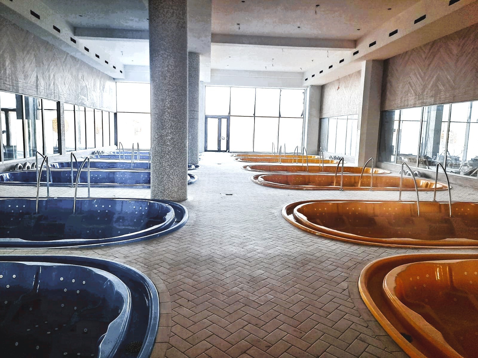 Najmniej ukończone są na razie wnętrza części strefy basenowej. W niektórych strefach ułożono już mozaiki z wzorami plam i ryb na ścianach, a niecki basenów zdobią drobne, niebieskie kafelki. W budowie jeszcze część ze zjeżdżalniami wodnymi.