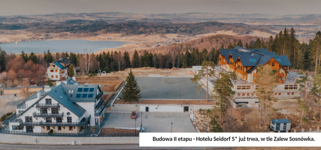 - 2 etap, Aparthotel z pełnym zapleczem usługowym - Inwestor wprowadził do sprzedaży apartamenty w aktualnie budowanej, nowej części resortu Hotelu Seidorf 5*. W budynku Aparthotelu z pełnym zapleczem usługowym i infrastrukturą powstanie w sumie 27 apartamentów. Termin oddania do użytkowania tego obiektu to koniec lutego 2019 r.