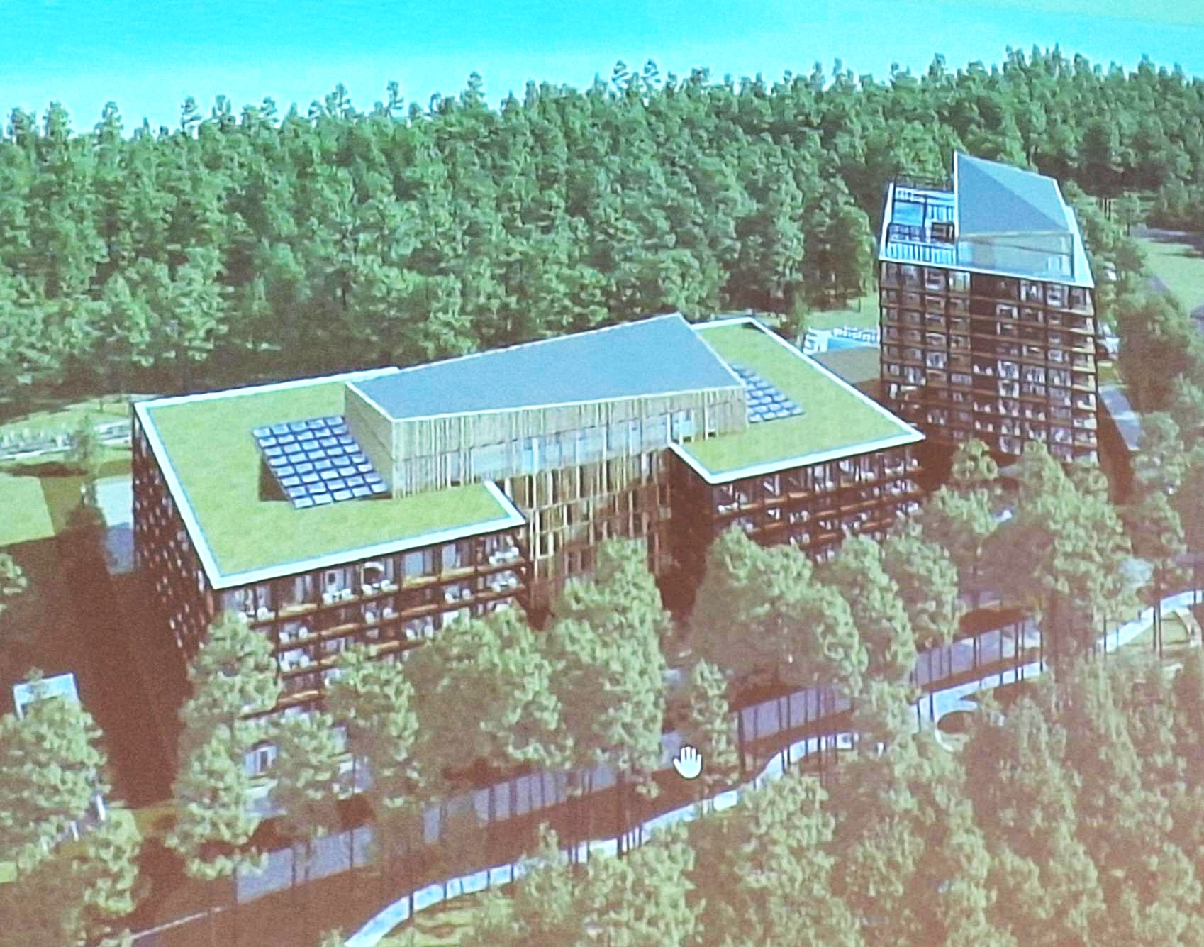 Wizualizacja projektu hotelu przedstawiona w materiałach dla radnych miasta w 2025 r, spółka Amber Baltic ze Świebodzić wnioskowała o zmianę planów dla 3 działek od strony wiatraka (114/14, 114/16 oraz 114/21), Zdrojowa Invest planuje z kolei Grand Baltic na działce nr 114/38
