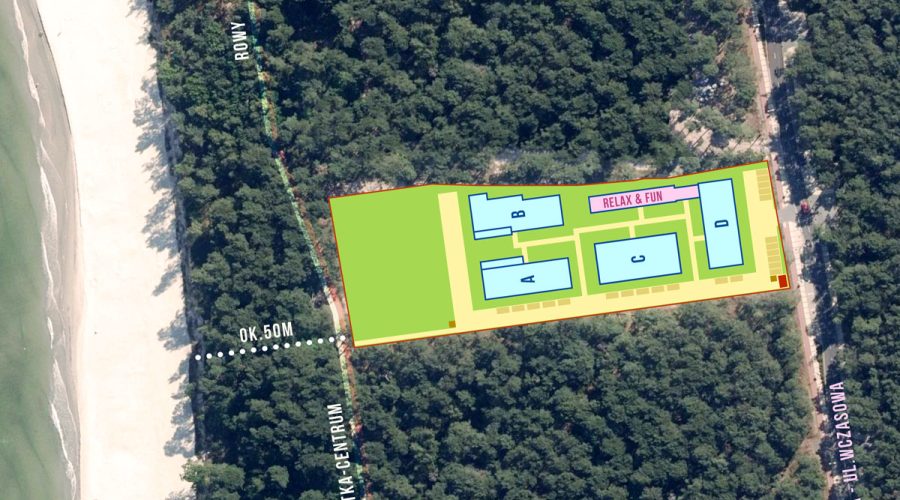 Lokalizacja jest naprawdę TOPowa, z działki na której ma stanąć inwestycja wychodzi się dosłownie na plażę, wokół pas nadmorskiego lasu sosnowego, ale nie gęstego, dzięki temu jest tu dużo światła i słońca. Sama ul. Wczasowa, przy której stanąć mają 4 budynki, już kilka lat temu została uporządkowana i wyremontowana. Dziś jest prawdziwie kurortową ulicą, z równym chodnikiem, lataniami i lasem wokół. Nie ma tu krzyczących reklam, plastikowych budek z jedzeniem i tandetnych kramów jak w wielu nadmorskich kurortach.