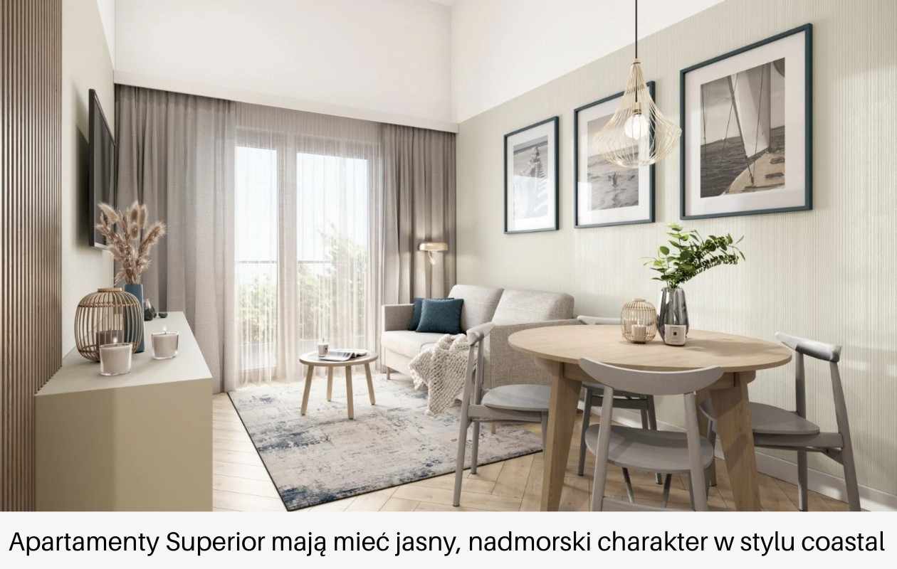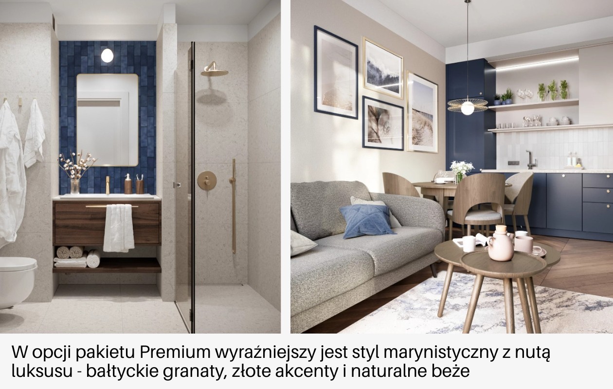 Apartamenty sprzedawane są wykończone pod klucz w dwóch opcjach: Superior oraz Premium. Pierwsze jasne, minimalistyczne, nawiązujące do plażowej stylistyki. Te spod znaku Premium o podwyższonym standardzie charakteryzują się luksusowymi akcentami grantu i złota.