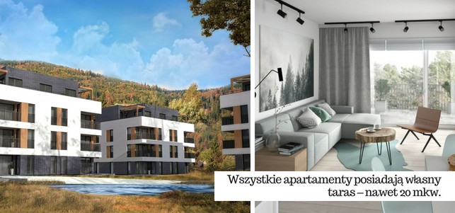 Wszystkie apartamenty posiadają własny taras – w wybranych lokalach ma on nawet 20 mkw. Budynki oraz poszczególne apartamenty wykonane będą z materiałów najwyższej jakości i urządzone w górskiej stylistyce. Drzwi każdego z apartamentów oraz klatek schodowych wyposażone zostaną w nowoczesne zamki otwierane elektronicznie (na kartę), same apartamenty też będą posiadały opcję zdalnego zarządzania np. ogrzewaniem za pomocą smartfona. - Wnętrza zaaranżowane będą w oparciu o aktualne trendy i nowoczesny design. Mają przyciągnąć nie tylko miłośników naturalnej, spokojnej stylistyki, ale też znacząco wpływać na komfort wypoczynku. Stawiamy na wysokiej jakości wyposażenie i sprzęt, wygodne meble, miękkie tkaniny – informuje Agnieszka Duźniak. I jak dodaje, w całym projekcie widoczne będą silne nawiązania do nowoczesnej, stonowanej stylistyki skandynawskiej.