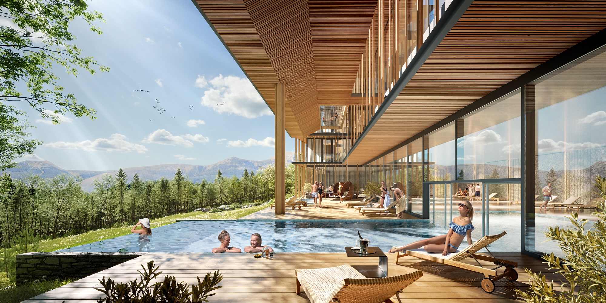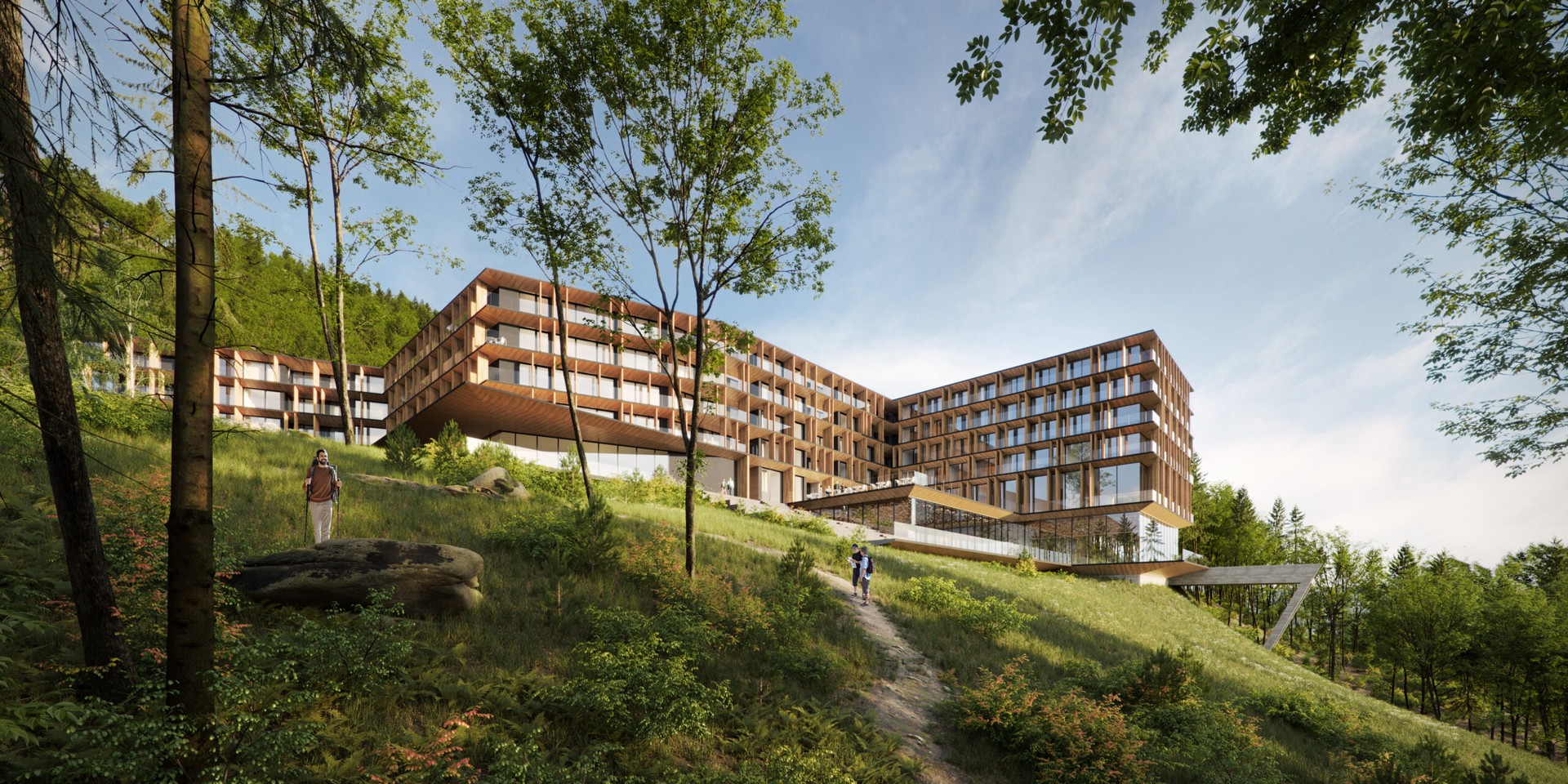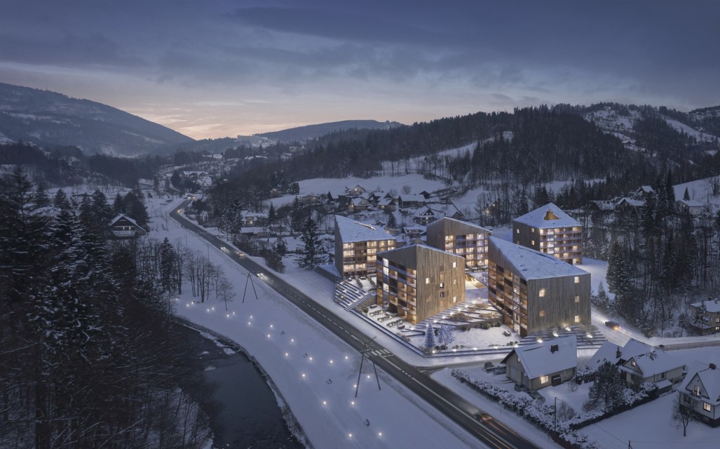 Ostatnia z koncepcji autorstwa pracowni Q2 - tak miał wyglądać hotel Vista Wisła. Obecnie nowy inwestor pracuje z architektami z Q2 nad zmianami w obiekcie, który budowany będzie jako Belomonte Wisła -