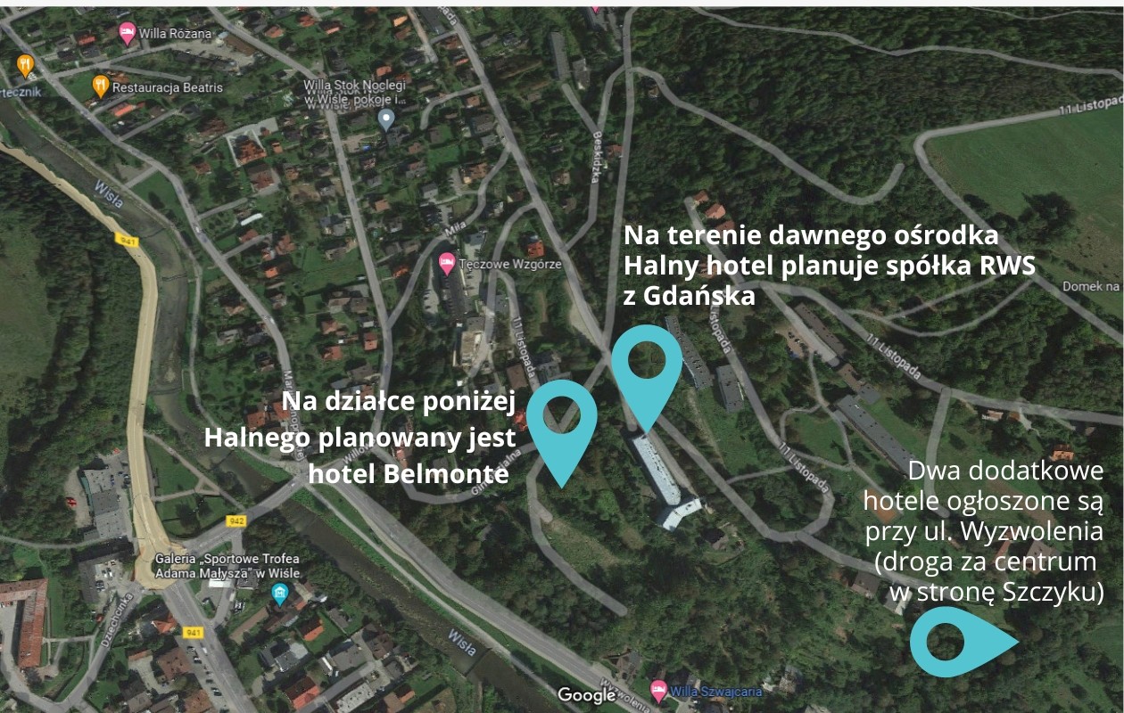 Budowę hotelu planuje w Wiśle też pochodząca z Gdańska Grupa RWS. Firma realizuje inwestycje nie tylko hotelowe, ale też biurowe i mieszkaniowe. Na terenie dawnego domu wczasowego Halny przy ul. 11 listopada firma proceduje możliwość postawienia 6-kondygnacyjnego hotelu ze 182 lokalami (pow. całkowita ponad 17 tys. mkw.). Wstępnie zaplanowano mniejsze lokale od 26 mkw. do nawet 130 mkw. W ramach części wspólnych powstać tu ma też m.in. restauracja, sale konferencyjne, strefę SPA, sala do jogi, siłownia i kids club – podaje deweloper na swojej stronie internetowej. Hotel Halny projektuje dla inwestora pracownia Q2.