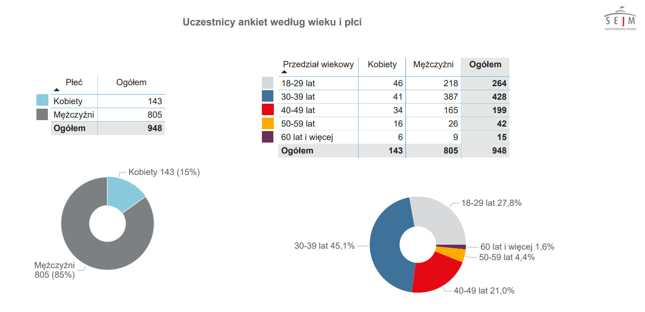 Zaskakująco dużo w liczbie wszystkich opinii było głosów mężczyzn – stanowili aż 85% (805 osób) wszystkich głosujących. Blisko połowa głosujących: 45,1%, to osoby w wieku 30-39 lat, ale sporo głosów (27,8%) wyrazili też ludzie młodzi w wieku od 18 do 20 lat.