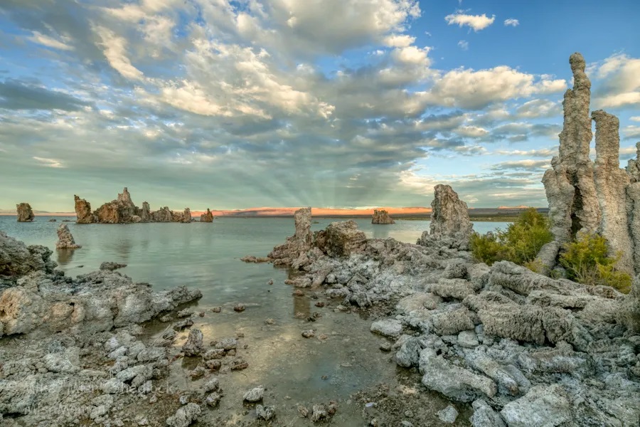 Otoczenie natury blisko miasta widma, jezioro Mono Lake. Na pięknych zdjęciach Mikea "Mish" Shedlock'a ten zbiornik wodny wpisuje się klimatem w wymarłe miasetczko - rozrzucone, pojedyńcze skałki góruja nad taflą wody, jak ocałałe jeszcze w Bodie zabudowania nad prerią w otoczeniu gór