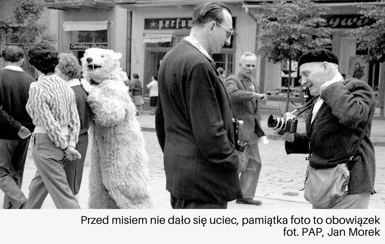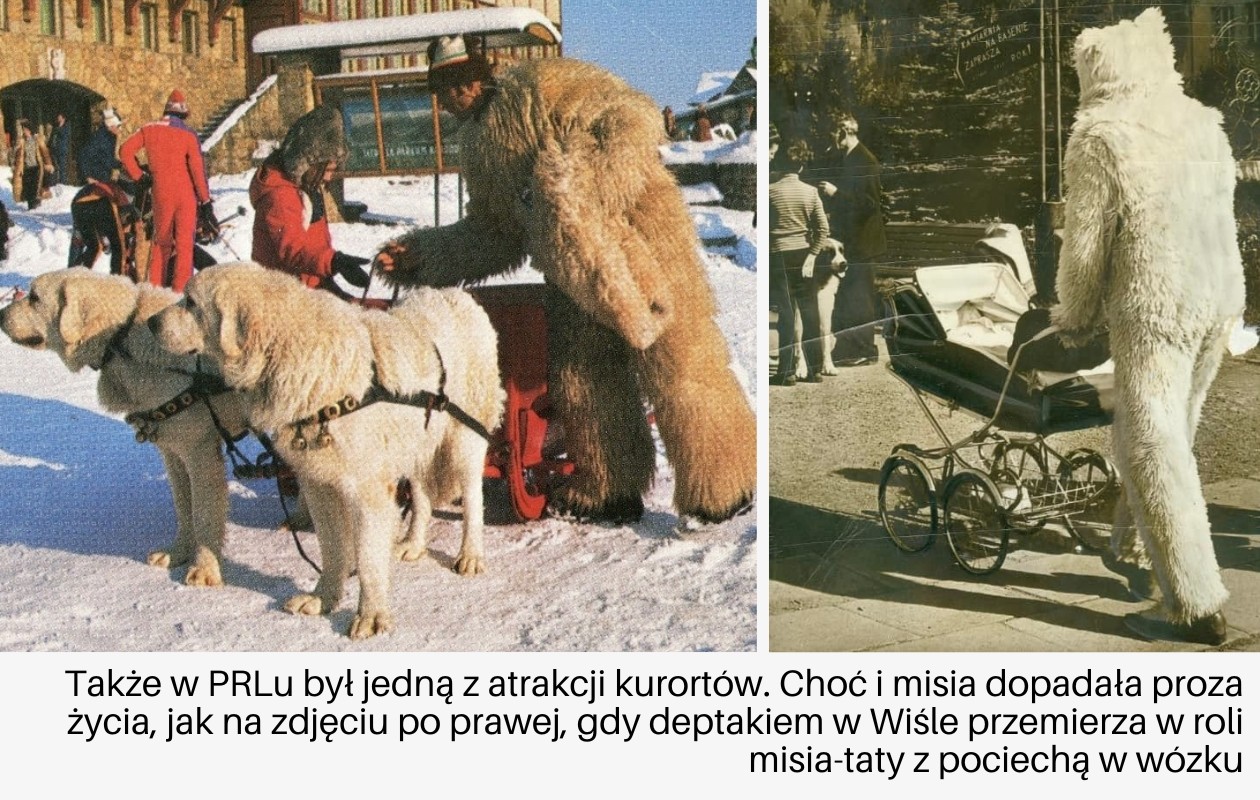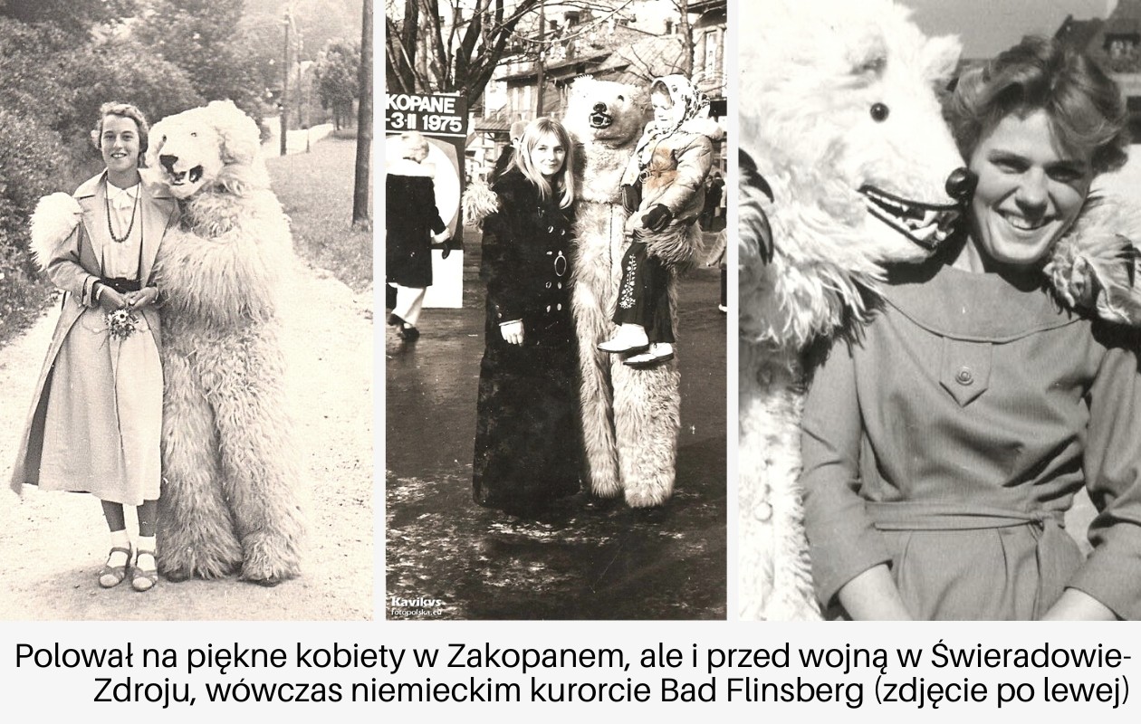 Pozował to z klasą, oficjalnie stając obok turystów, Ale i figlarnie - strasząc lub rozśmieszając przechodniów. Zmieniała się też sceneria – zima, lato, na deptaku, przy motorze, przyłapany prywatnie w drodze z dzieckiem w wózku. Im starsze zdjęcia tym niedźwiedź bardziej przerażający, niedoskonałość stroju wyraźnie rzuca się w oczy. I w PRLu potrafił napędzić strachu. - Ten biały miś to największa trauma mojego dzieciństwa, musieliśmy omijać go dużym łukiem – wspomina jedna z mieszkanek Wisły tamtejszego niedźwiedzia pozującego do zdjęć na deptaku w latach 70’. W jego rolę wcielał się Władysław Wisełka, a pamiątkowe zdjęcia wykonywał wiślański fotograf Stanisław Urbaniak.
