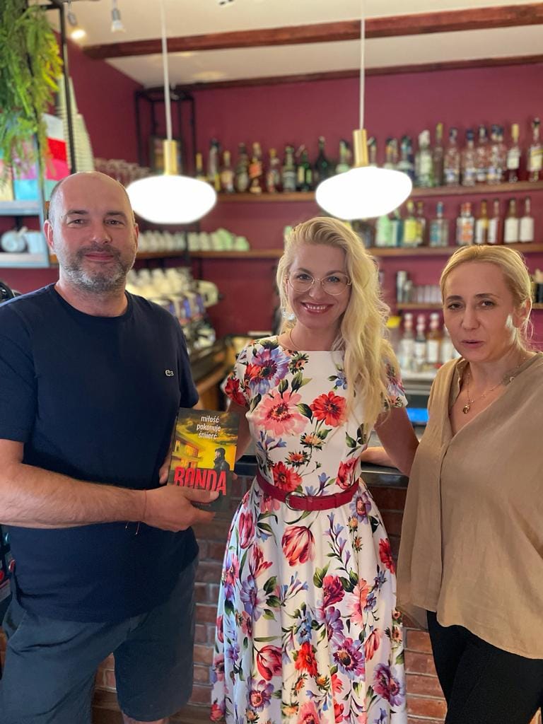 Katarzyna Bonda w towarzystwie właścicieli Cafe 5 - łebskiej kawiarnii i palarni. Małżeństwo nie tylko gościło pisarkę, ale pomogło jej także w przygotowaniu tła książki "Efekt morza" wprowadzając autorkę w lokalne niusane i legendy. Kawiarnia istnieje i pojawia się dokładnie pod tą nazwą w kryminale, fot. Cafe 5