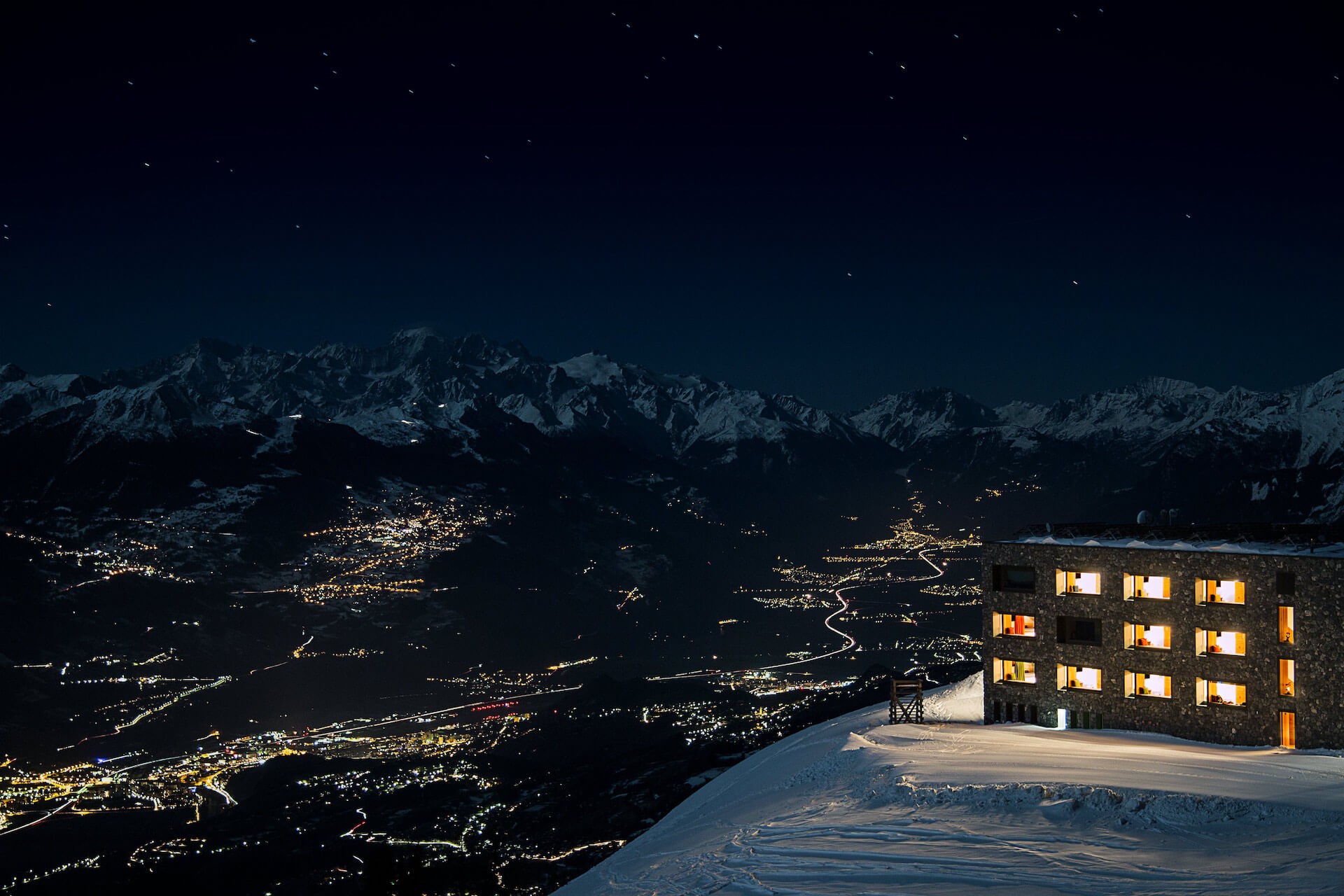 Bryła hotelu położonego 2 112 metrów nad ziemią nie dominuje ani wielkością, ani wysokością, ani kolorem. Wtapia się, nie przeszkadza naturze, współgra z nią przez cały rok.