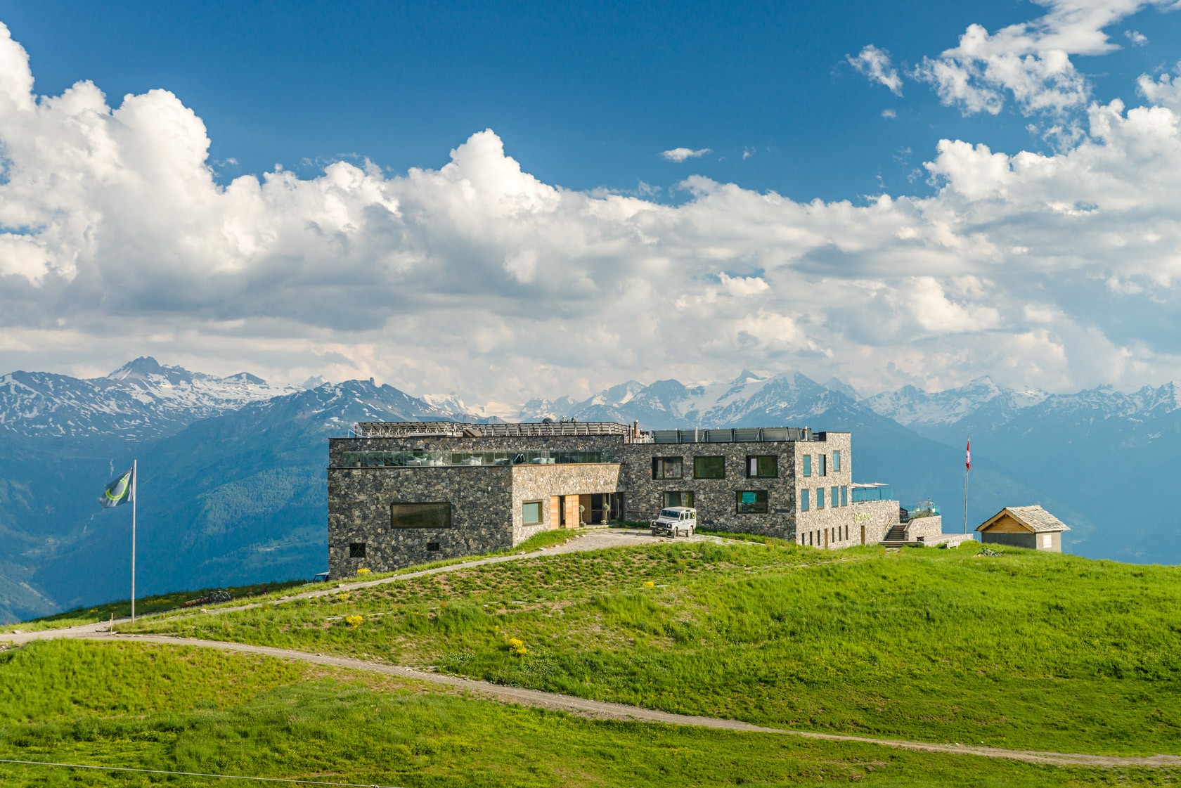 Budynek pochodzi z lat 60-tych. Był górną stacją górskiej kolei gondolowej. Góruje nad położonym w dole kurortem Crans-Montana.