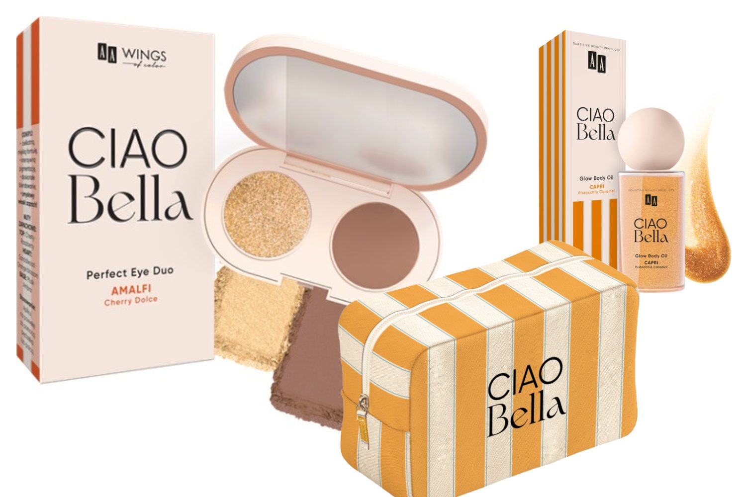 Nowa linia AA Wings of Color Ciao Bella, stworzona została we współpracy z influencerką Amelią Szczepaniak. Ma trzy zapachy nazwane dokłatnie tak jak włoskie kurorty nadmorskie: AMALFI Cherry Dolce, POSITANO - Tonic Espresso oraz CAPRI - Pistacchio Caramel.