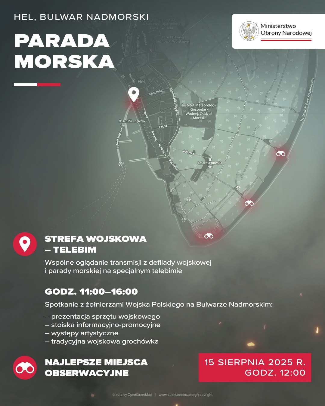 Parada 15 sierpnia 2025 r. rozpocznie się ok. godz. 12.00 i potrwa do 14.30. Jak informują służby Marynarki Wojennej najlepiej oglądać paradę morską z 3 miejsc na cyplu w Helu (zaznaczone na mapce poniżej).