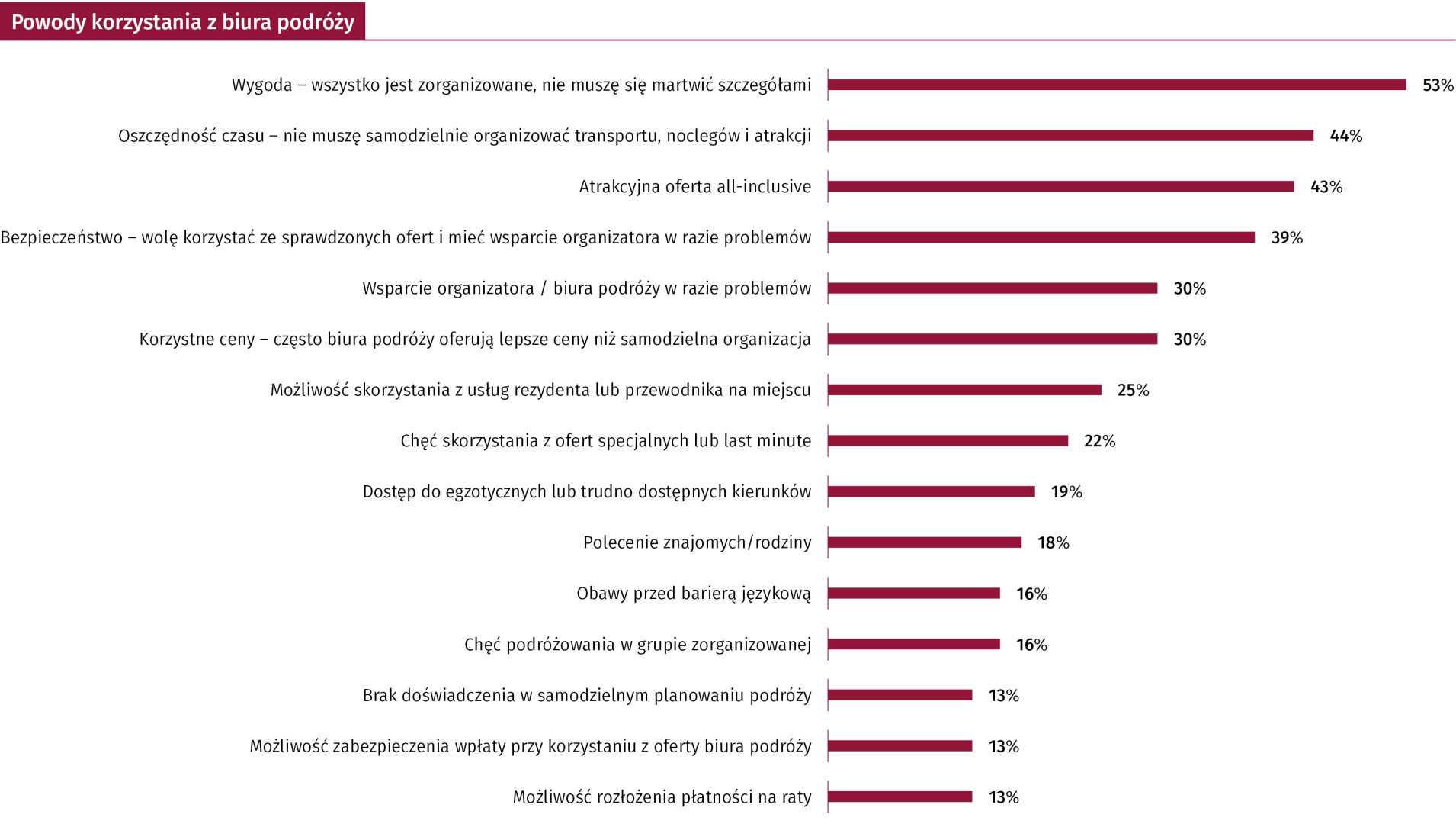 Turyści korzystający z biur podróży szukają nie tylko atrakcyjnych warunków finansowych, ale także zaufania, komfortu i szeroko pojętego wsparcia w podróżowaniu. Decyzja o skorzystaniu z usług biura podróży często opiera się na potrzebie wygody i ograniczeniu wysiłku związanego z organizacją wyjazdu. Wspomniane czynniki, czyli wygoda (53%) i oszczędność czasu (44%) – przeważają nad względami finansowymi czy ofertowymi. W dalszej kolejności Polacy wskazują na chęć korzystania z ofert all-inclusive (43%) oraz korzystne ceny (30%), które oferują biura podróży. Korzystają z wyjazdów zorganizowanych również z uwagi na poczucie bezpieczeństwa, które te zapewniają. Bezpieczeństwo to rozumiane jest zarówno jako opieka podczas podróży (39%), jak i pewność co do jakości usług (30%).