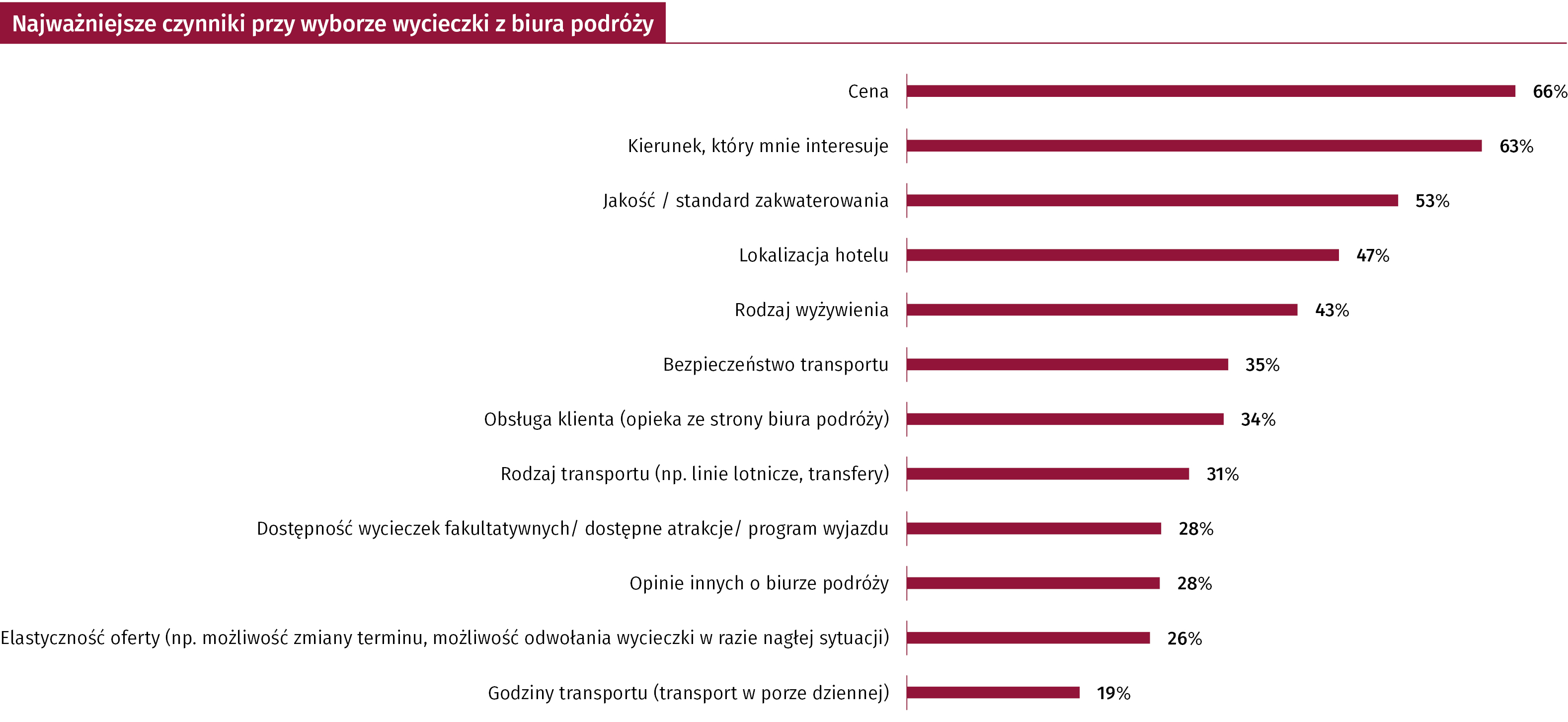 Dopiero później jest jakość zakwaterowania (53%) oraz odpowiednia lokalizacja samego hotelu (47%). Osoby planujące wakacje biorą też pod uwagę rodzaj wyżywienia (43%) i bezpieczeństwo transportu (35%). Obsługa klienta, na którą tak często zwraca uwagę branża hotelowa w wewnętrznych dyskusjach i szkoleniach ma znaczenie jedynie dla co trzeciego turysty (34% wskazań – choć dotyczą one nie samych hoteli, a jakości obsługi turystów przez biuro podróży). Jeszcze mniej uwagi w wyborze wakacji podróżujący poświęcają na fakt czy dostępne będą wycieczki dodatkowe (28%), opinie o biurze bierze pod uwagę jedynie 28%.