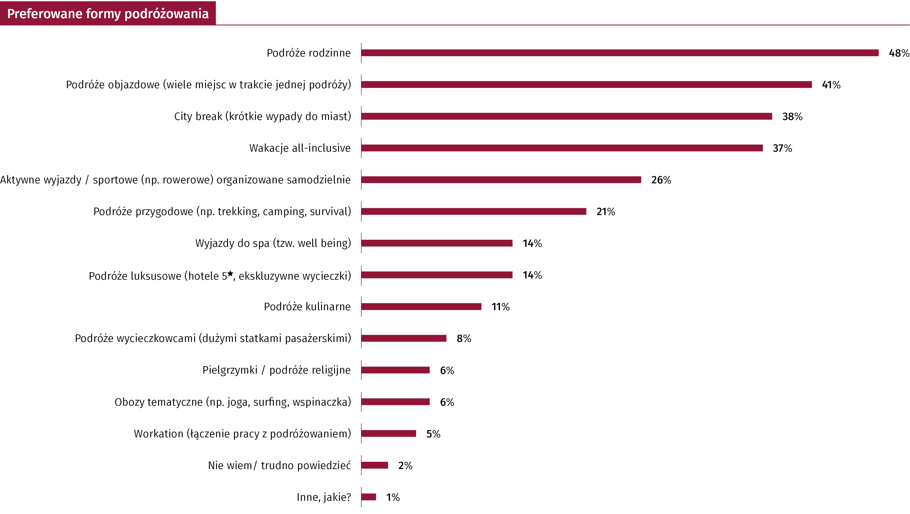 Bardziej wyspecjalizowane formy wypoczynku budzą dużo mniejsze zainteresowanie: 14% Polaków wybiera wyjazdy typu well-being i spa, a 8% kulinarne podróże.