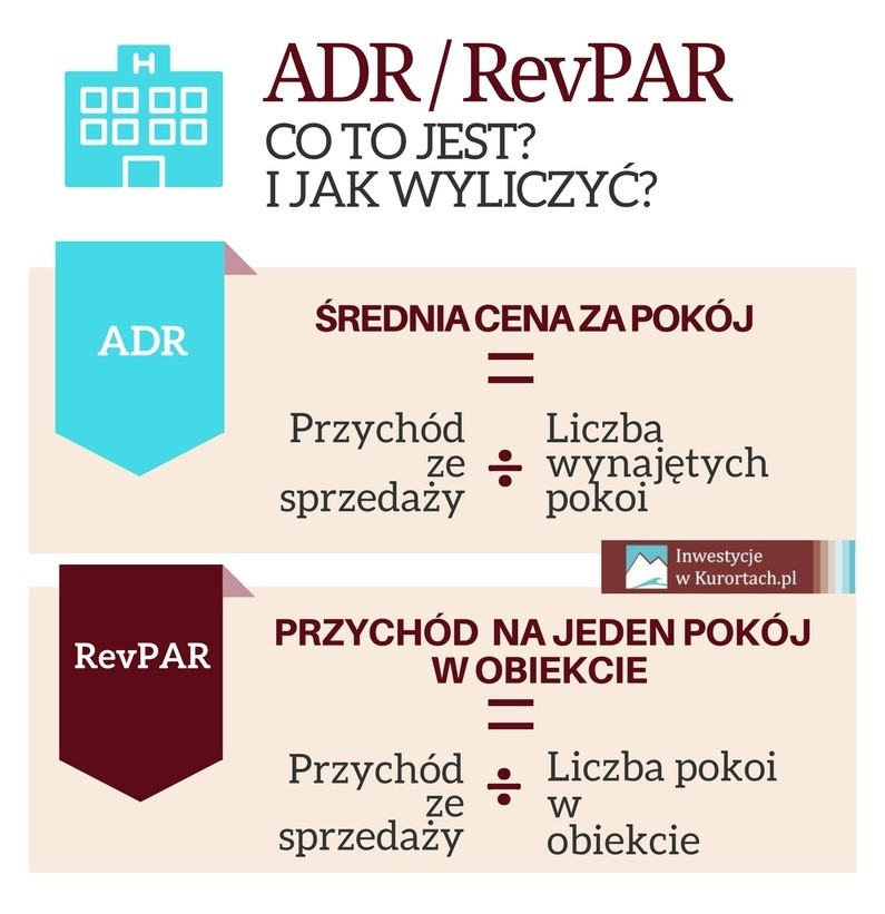 ADR (average daily rate) – czyli średnia stawka za wynajęty pokój (bez śniadania), nie uwzględnia się tu poziomu obłożenia. Wyliczamy ją dzieląc całościowe przychody z wynajmu pokoi przez liczbę wynajętych pokoi w danym okresie, np. dziennie. Po co się to wylicza i co nam daje taka analiza? Można zobaczyć jaką cenę uzyskujemy w stosunku do tego co było założone w biznesplanie hotelu – czy trzymamy poziom, czy raczej widać straty, a może przychody są dużo wyższe niż zakładane? W zależności od tego planuje się dalsze, bieżące ruchy biznesowe, np. jeśli wynik jest zły - podjęcie decyzji o nie udzielaniu rabatów na noclegi, lub podniesieniu cen.