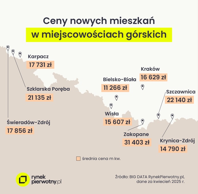 Równie wysoki poziom cen mieszkań charakteryzuje miejscowości górskie. Zakopane (31,4 tys. zł/m kw.) nie ma sobie równych. Nawet Kraków ze średnią ceną metra kwadratowego na poziomie ponad 16,6 tys. zł, nie wydaje się taki drogi. Drożej niż w Krakowie jest też w Szczawnicy (22,1 tys. zł/m kw.), Szklarskiej Porębie (21,1 tys. zł/m kw.), Świeradowie-Zdroju (17,9 tys. zł/m kw.) i Karpaczu (17,7 tys. zł/m kw.). Z kolei w Wiśle i Krynicy-Zdroju trzeba się liczyć z wydatkiem 15-16 tys. zł za metr kwadratowy.