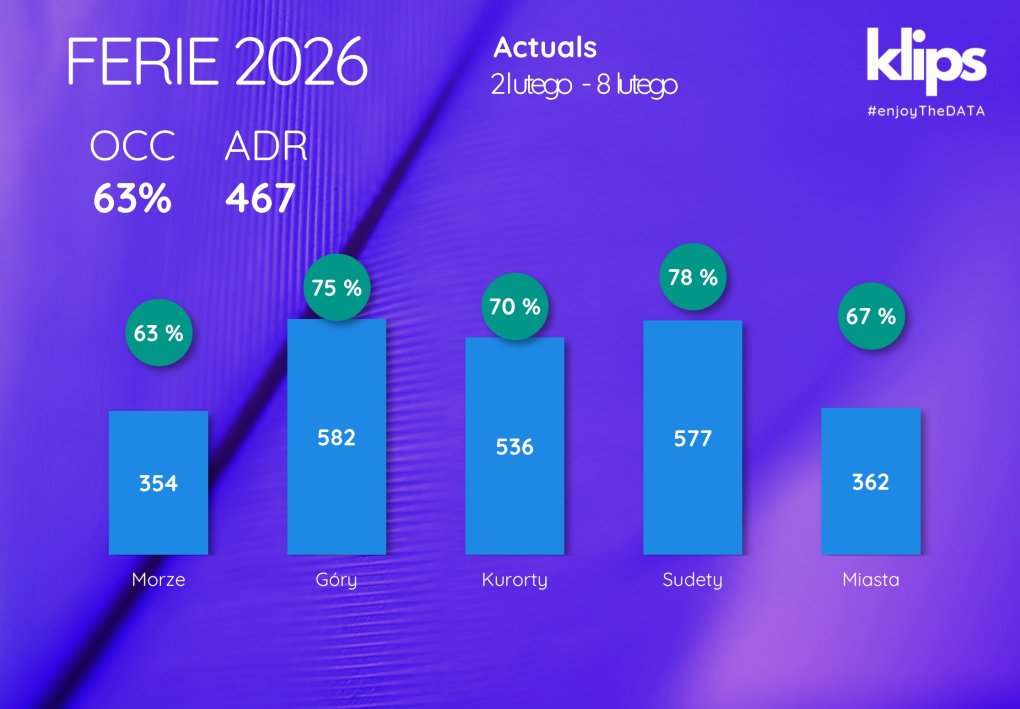 KLIPS data prognozował na 3 tydzień (2–8 lutego 2026 r.) ferii obłożenie na poziomie 62–65%, z danych już widać, że prognozy te były prawie idealne, obłożenie wyniosło 63%. Średnia cena ADR (Average Daily Rate, średnia cena za dobę na jeden sprzedany pokój) wyniosła 467 zł.