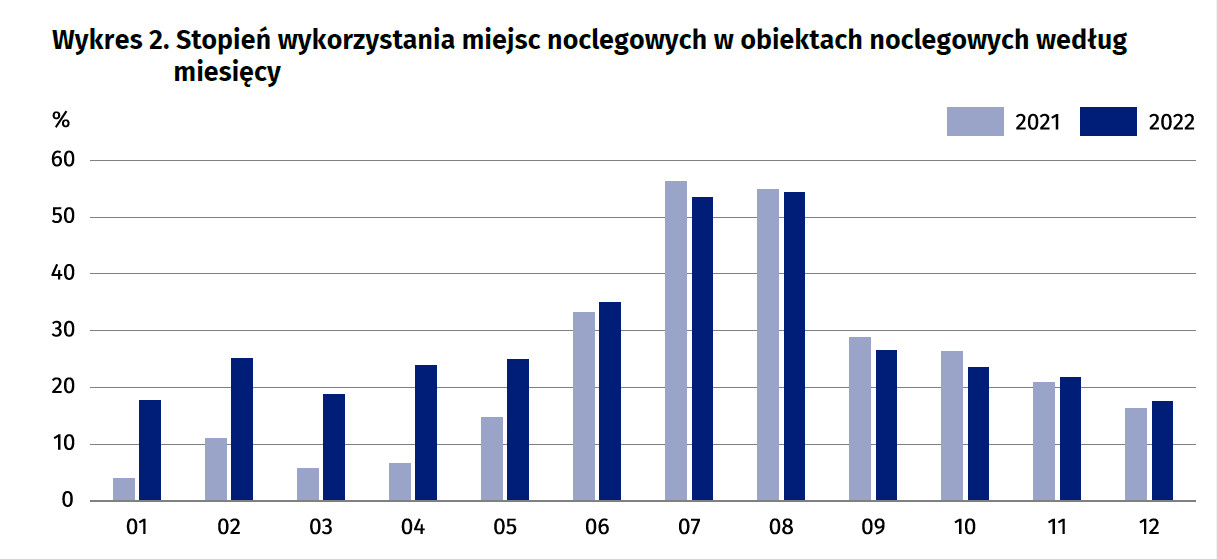 GUS podaje, że przeciętny pobyt obejmuje 3 noclegi. Udzielono łącznie nieco ponad 3 mln noclegów - co stanowiło wzrost o 20,5% więcej niż w 2021 roku.
