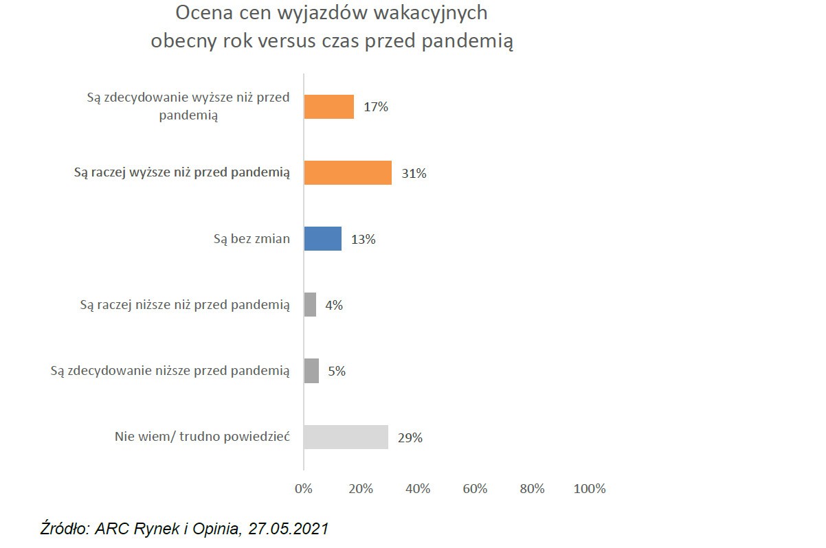 Także blisko połowa badanych (48%) ocenia, że tegoroczne ceny wyjazdów wakacyjnych są wyższe niż przed pandemią.
