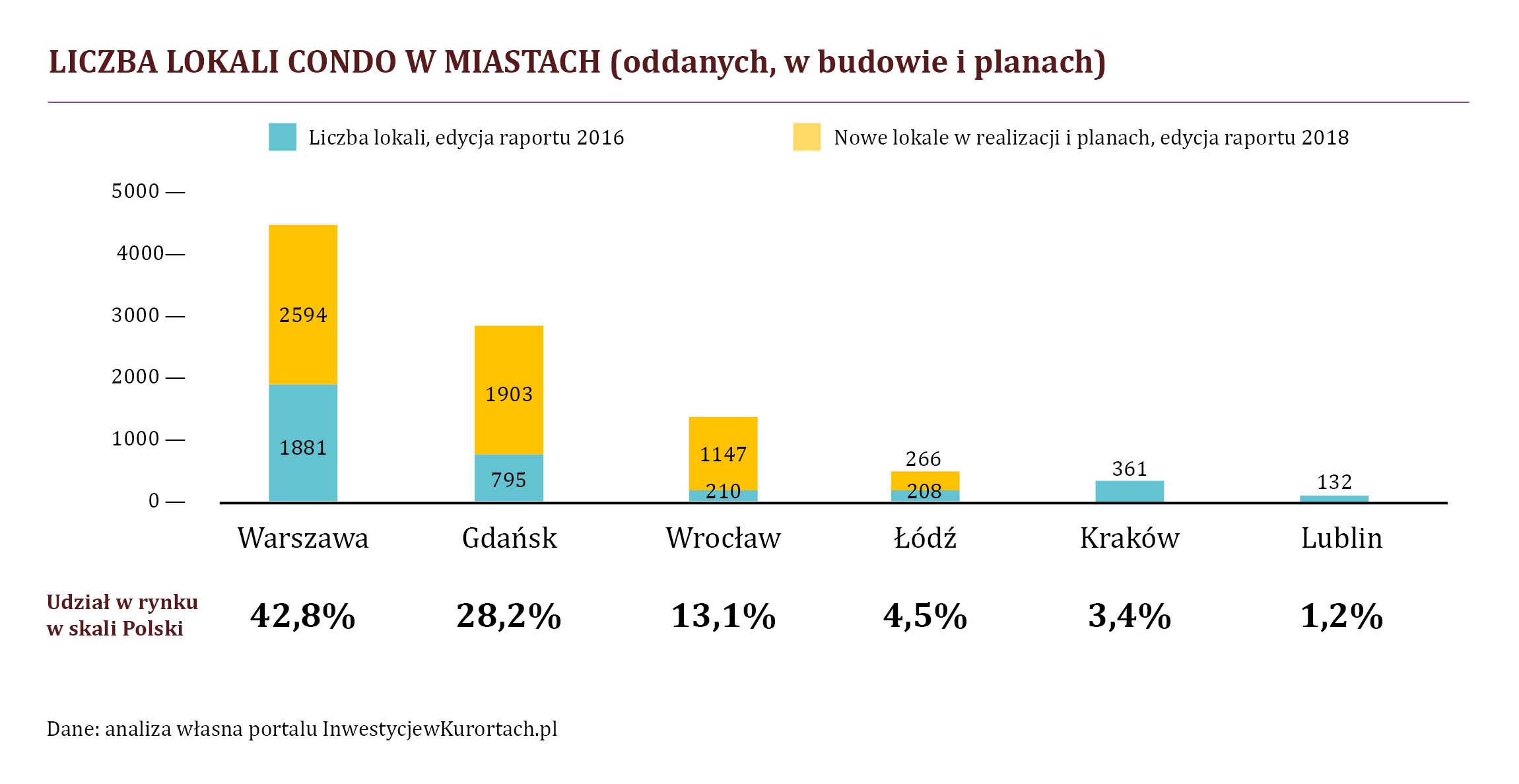 Portal InwestycjewKurortach.pl już po razu drugi przeprowadził analizę rynku condo w największych polskich miastach. Poprzednia edycja ukazała się jesienią 2016 roku. Już wówczas, wywodzący się z kurortów, rynek nieruchomości sprzedawanych w systemie condo mocno przyspieszył także w miastach. Wówczas w budowie i planach było, biorąc pod uwagę 22 inwestycje aż 3 713 jednostek condo (rozumianych jako pokoje hotelowe i apartamenty). Jednak ostatnie 2 lata to prawdziwy boom. Pojawiło się 15 nowych deweloperów w tym segmencie. W sumie w budowie i planach jest 29 nowych inwestycji obejmujących 6 474 lokali condo.