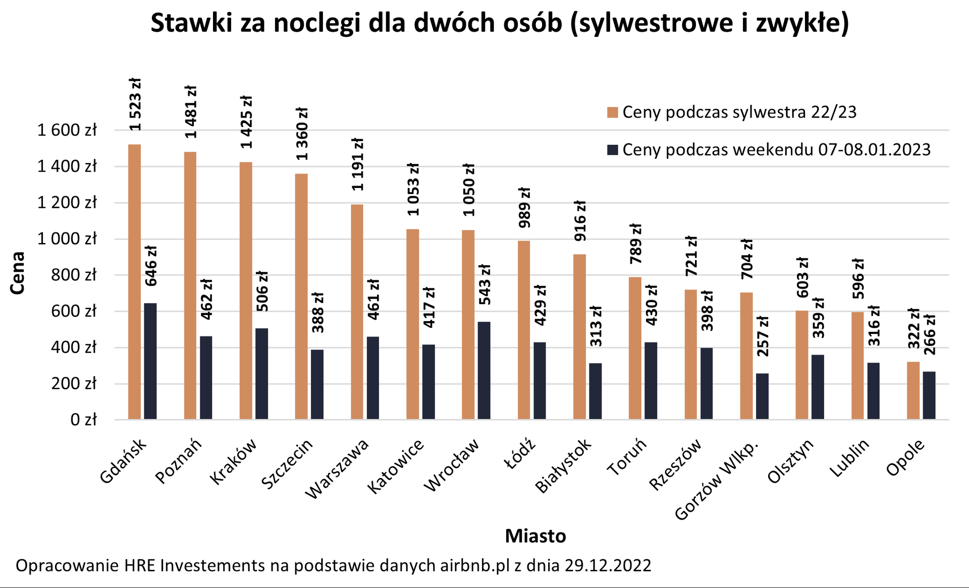 Mniejszy bonus za ostatnią noc w roku musimy zapłacić w Białymstoku, Krakowie, Gorzowie Wielkopolskim, Warszawie, Katowicach, Gdańsku i Łodzi. Nawet jednak w tych przypadkach stawki różnią się ponad dwukrotnie od standardowych.