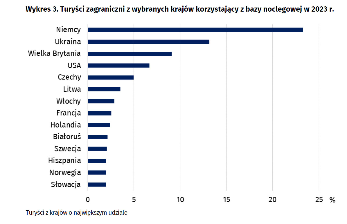 Na razie jednak patrząc na dane GUS gości z krajów arabskich, choć tak widocznych w mediach, nie widać w statystykach. W 2023 r. niezmiennie od lat najsilniejszą grupę nocującą w polskich obiektach stanowili goście z Niemiec (1,6 mln), następnie z Ukrainy (931,4 tys.) i Wielkiej Brytanii (642,1 tys.). Kolejne pozycje to: USA (472,2 tys.), Czesi (351,9 tys.) – którzy w 2023 r. silnie pojawili się nie tylko w Beskidach i Karkonoszach, ale też nad Bałtykiem. Kolejne pozycje zajmują: turyści z Litwy (250,9 tys.), Włoch (202,8 tys.) i Francji (181,0 tys.).