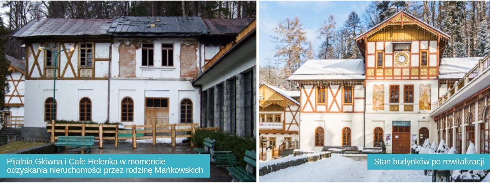 Helena Mańkowska: Wymagające :-) Zabytkowe budynki były w opłakanym stanie, kilku z nich zresztą już nie da się uratować. Willa Modrzewie (użytkowana w PRL jako szpital) wymagała gruntownego remontu. Dworek Gościnny, działający przed laty podobnie jak dziś, czyli jako centrum kultury, w 1962 roku cały spłonął w pożarze i został odbudowany od fundamentów na podstawie archiwalnych fotografii. Od 2004 roku, krok po kroku przywracamy dawną świetność kolejnym budynkom. Nie tylko komercyjnym. Remontujemy też mniejsze zabudowania, jak zabytkowe, ogólnodostępne altany pijalni wód mineralnych, parki, rzeźby, neogotycką kapliczkę z 1847 roku. Krytyczne głosy zawsze będą. Ale my wiemy, że chcemy przywrócić Szczawnicy świetność, którą miała za czasów naszego pradziadka.